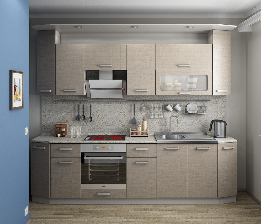 - линейные (прямые) — стандартный вариант с напольными и навесными шкафчиками для расположения вдоль стены;