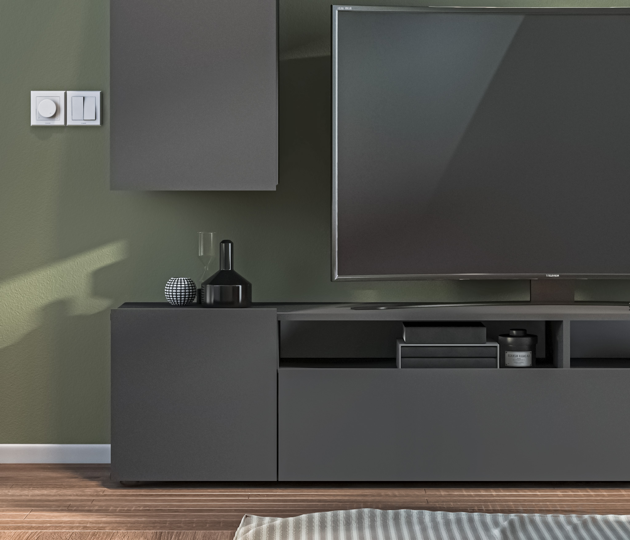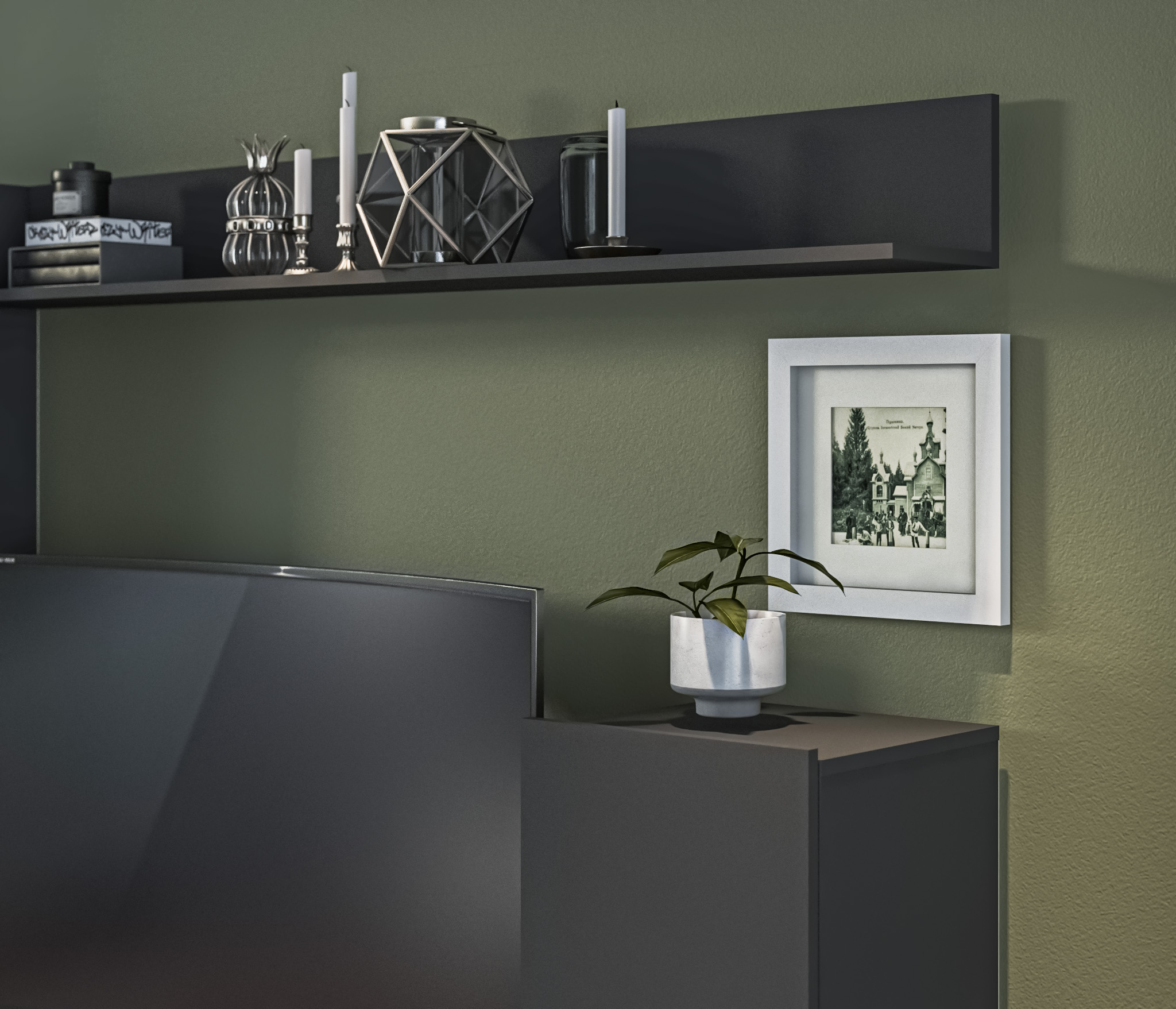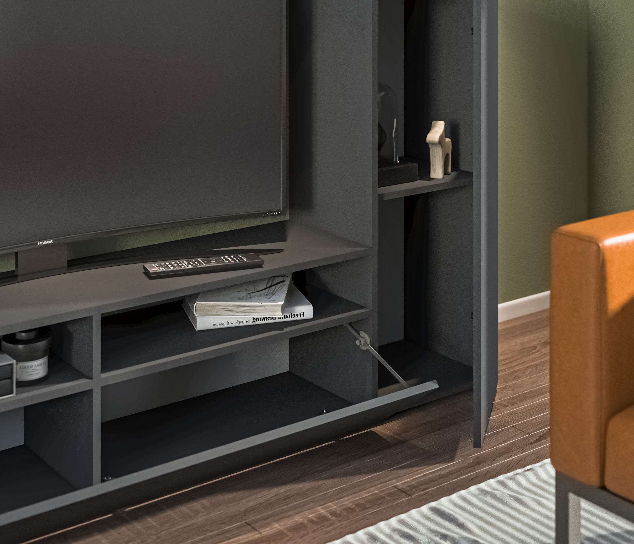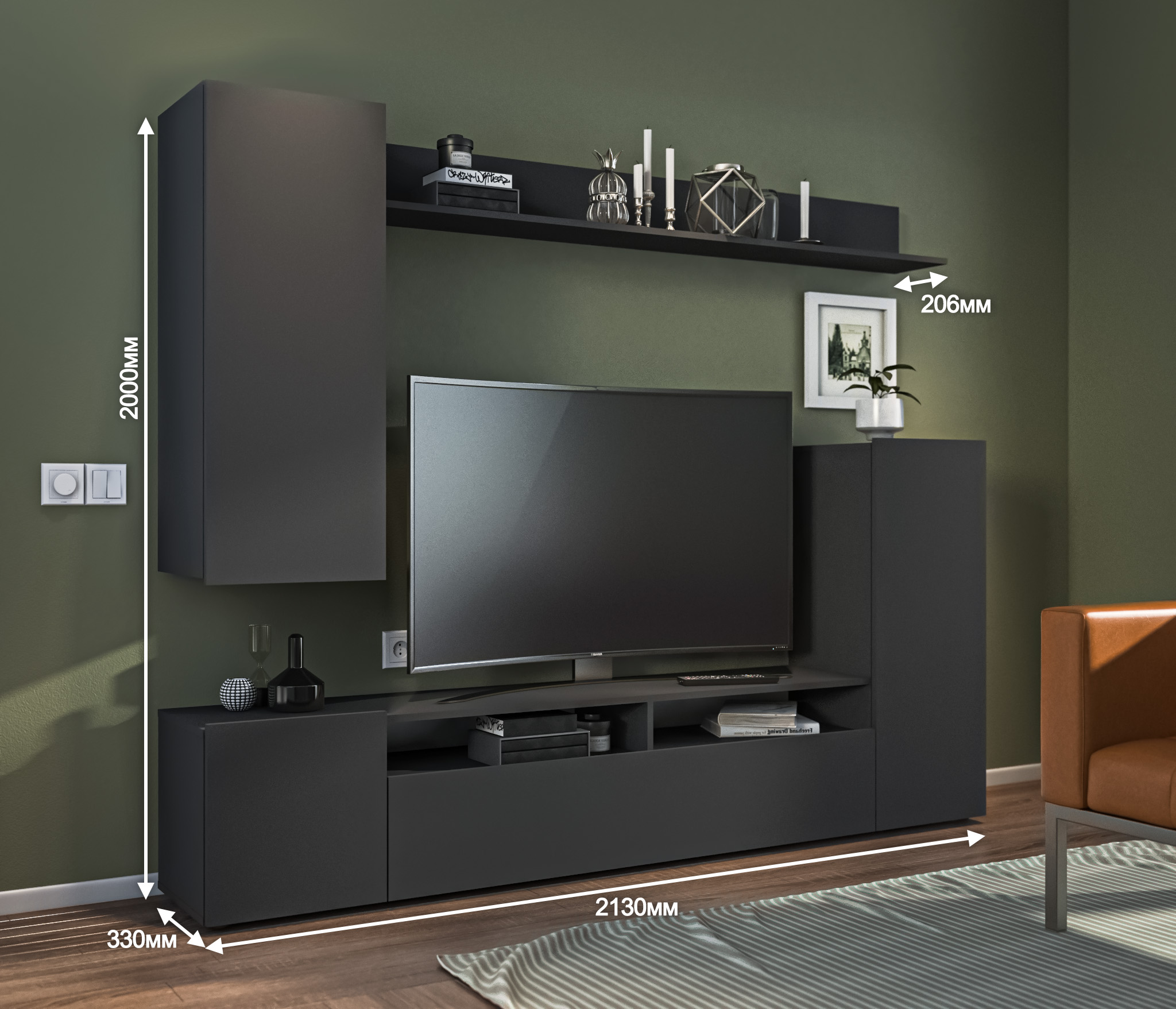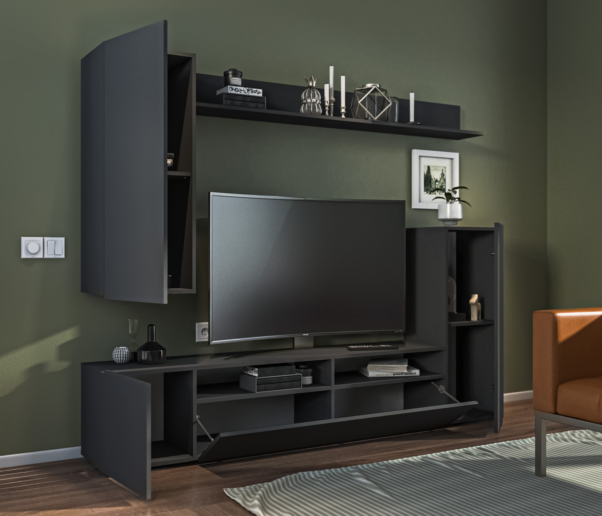 В состав стенки входит: тумба под телевизор с открытыми полками для видео, аудио аппаратуры и отделениями с непрозрачными дверцами, открытая полка для демонстрации коллекции декоративной посуды или памятных сувениров, закрытые модули для книг, посуды..