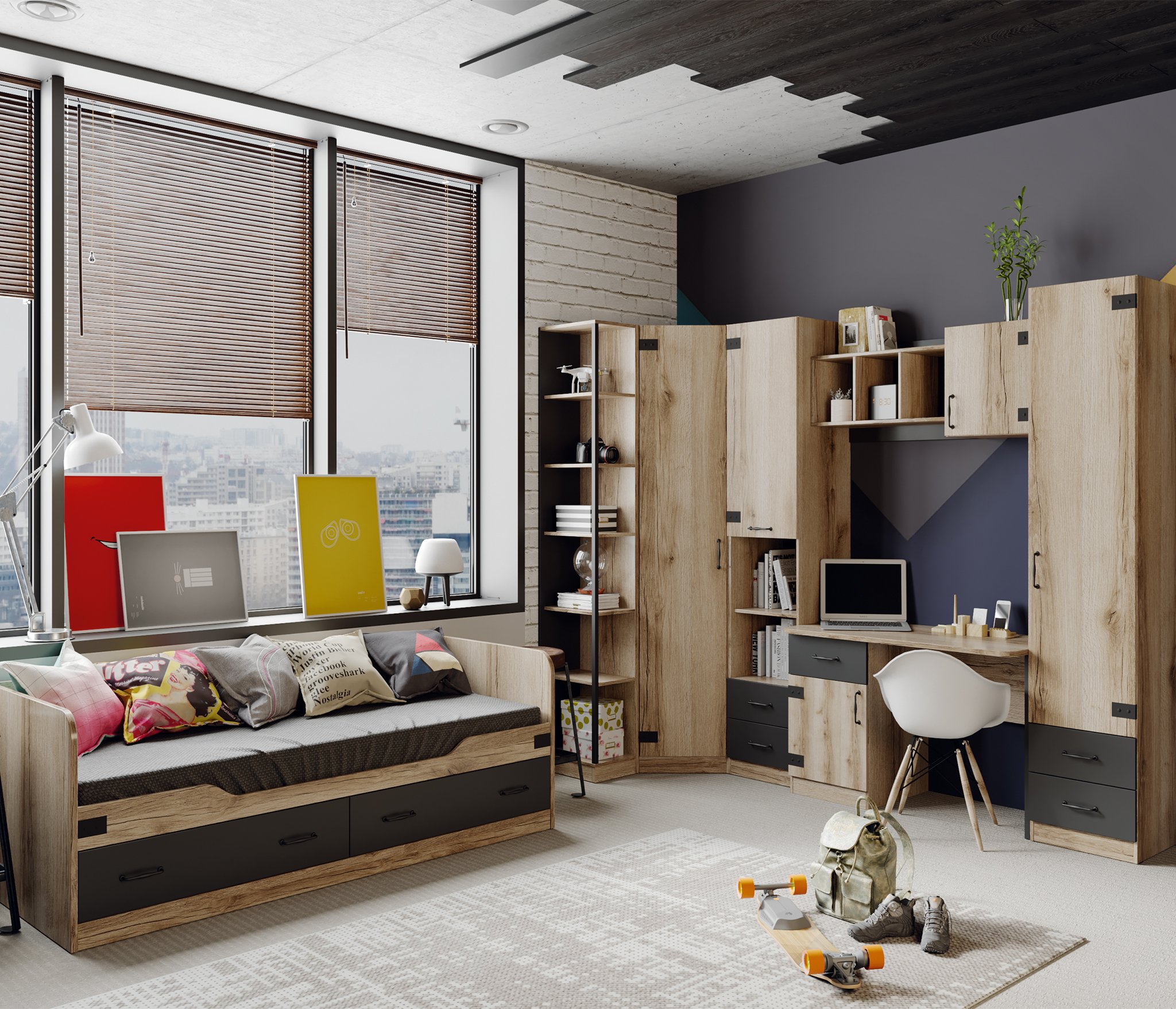 Детская выполнена в древесной текстуре "дуб делано" в сочетании с черным фоном.