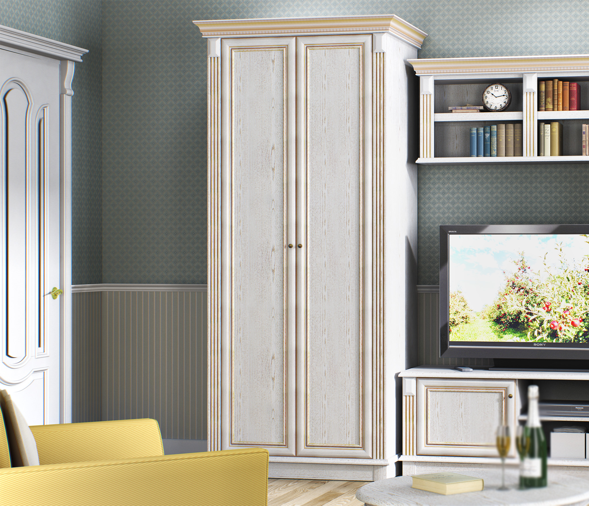 Двухдверный шкаф Версаль СБ-2045 органично впишется в интерьер гостиной, прихожей, спальни или кабинета в классическом стиле. Это оптимальное решение задачи хранения.