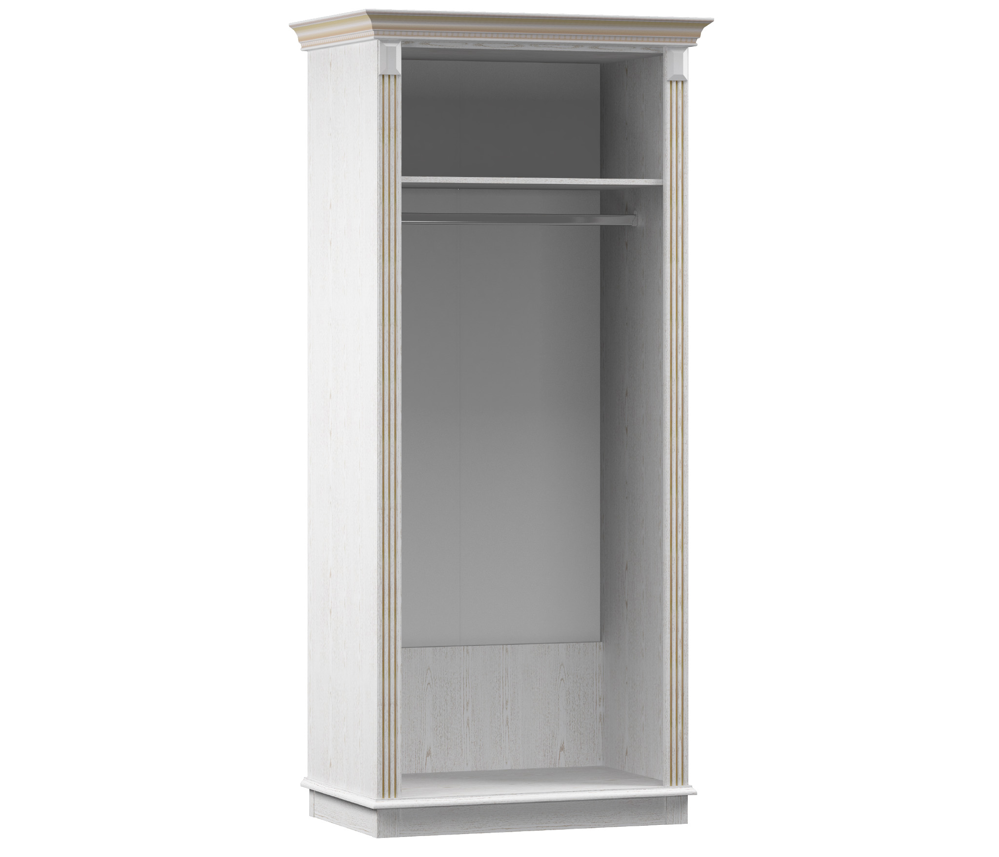 Габаритные размеры шкафа далеки от компактных – ширина 99 см, высота 218 см и глубина 62 см. Шкаф имеет одно вместительное отделение со штангой для аккуратного развешивания верхней одежды и верхнюю антресоль. Изделие имеет сдержанный благородный дизайн и является элементом модульной коллекции Версаль. Корпус шкафа выполнен из КДСП, фасады - из МДФ. Светлый оттенок «Белый ясень» и стильные декоративные элементы - карниз-корона и пилястры - придают шик и винтажность данной модели.