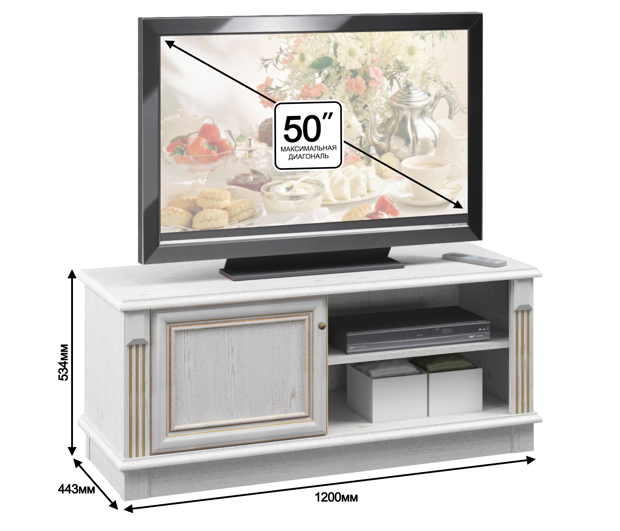 Габаритные размеры – ширина 120 см, высота 53 см и глубина 44 см. Вес тумбы 36,85 кг, что даёт возможность передвигать её по усмотрению. Под столешницей расположены две открытых полки и отделение с отдельной дверцей. Тумба выполнена в классическом дизайне из прочного современного КДСП в цвете «Белый Ясень», рамочный фасад выполнен из МДФ.