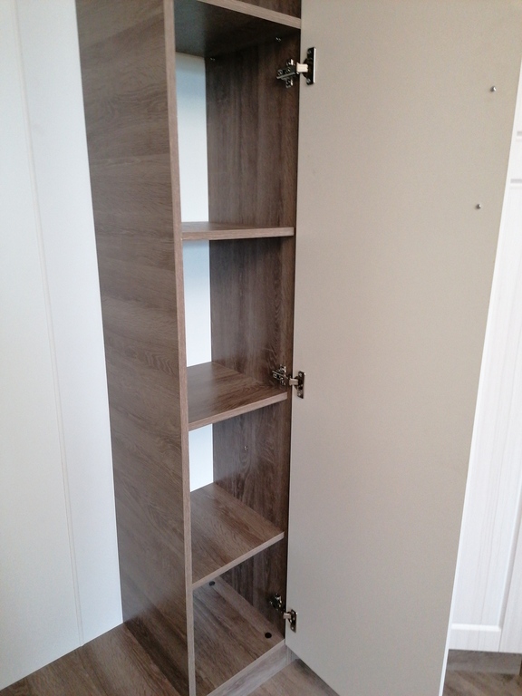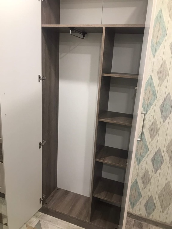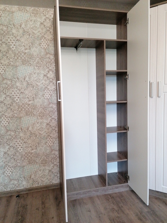 Узкий шкаф отлично вписался в комнату возле выхода на балкон, не мешает полностью открыть дверь на балкон. Вместительные полочки.