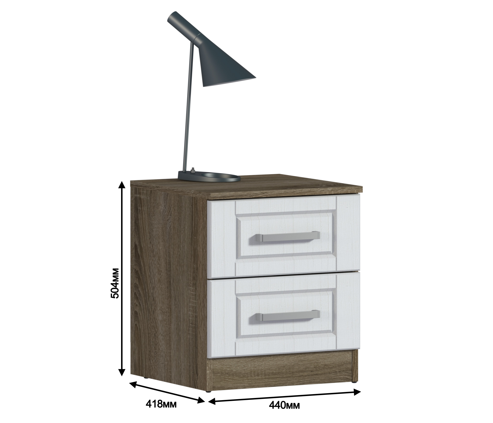 Габаритные размеры – ширина 44 см, высота 50 см и глубина 44 см. Под столешницей расположены два ящика, оснащённые прочным выдвижным механизмом.Корпус выполнен из КДСП в цвете «Дуб Сонома Трюфель». А фасадная поверхность – из МДФ в цвете «Сандал Белый».
