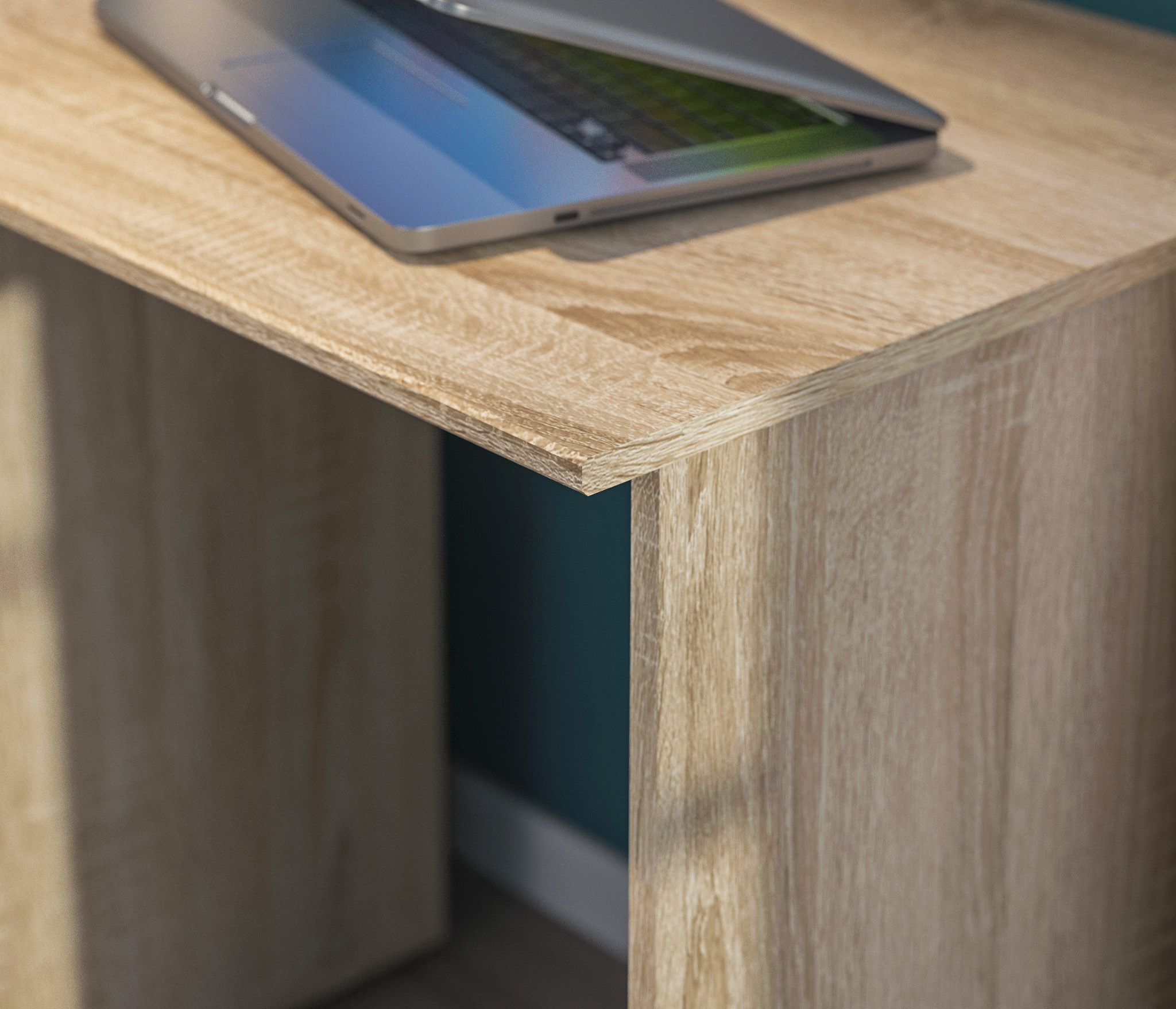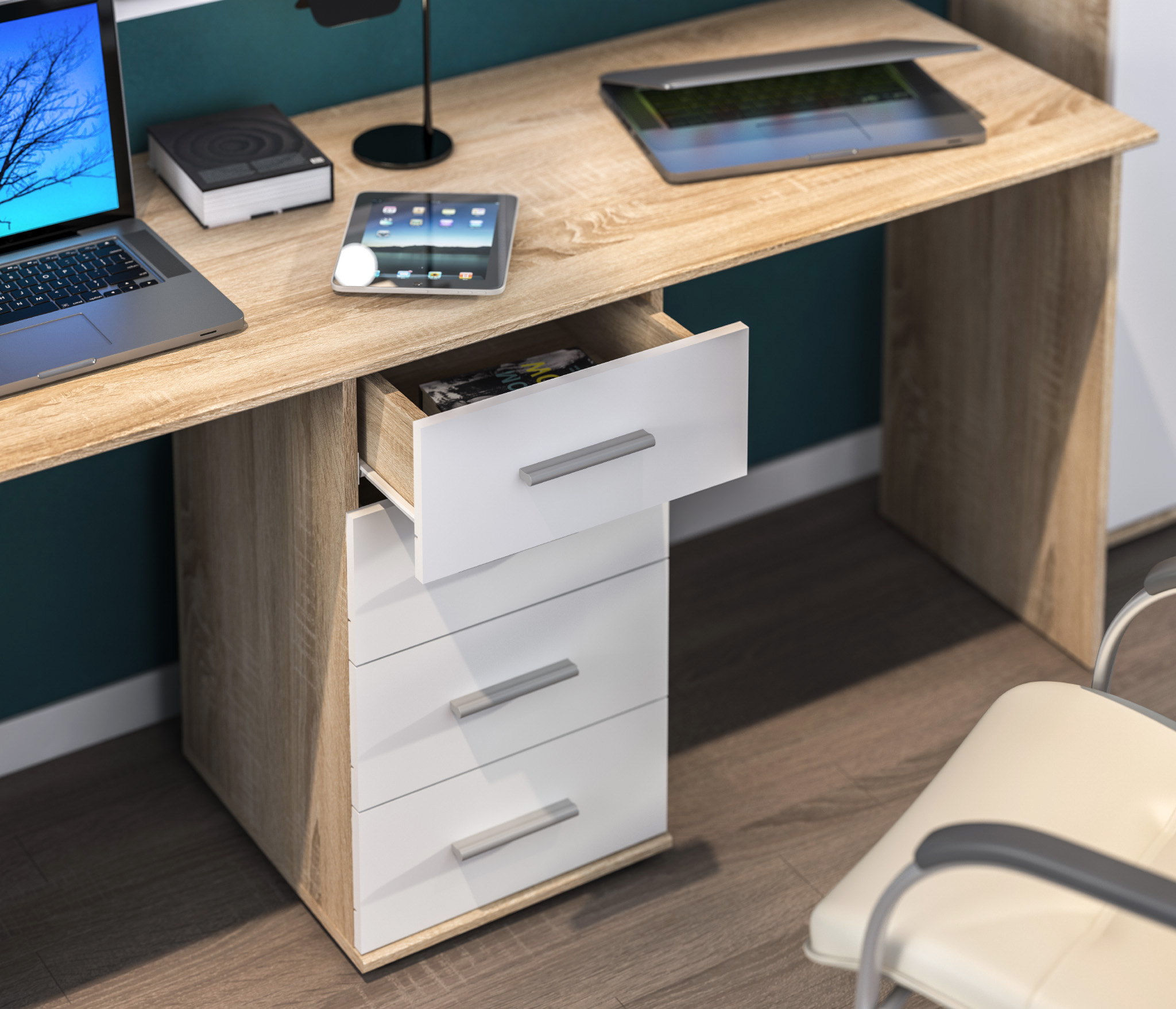 Стол-тумба Мамбо СБ-2753 – продуманное и комфортное рабочее место. Идеальный вариант, если есть необходимость в двух письменных столах. Простая конструкция, светлый оттенок и лаконичный дизайн позволят без проблем разместить стол-тумбу Мамбо в детской, комнате школьника или студента, а также в кабинете. Габаритные размеры – ширина 176 см, высота 75 см и глубина 59 см. Посередине под рабочей поверхностью расположена тумба с четырьмя вместительными выдвижными ящиками. Стол произведен из современного экологичного КДСП. Корпус и рабочая поверхность выполнены в цвете «Дуб Сонома», фасадные поверхности в белом цвете.