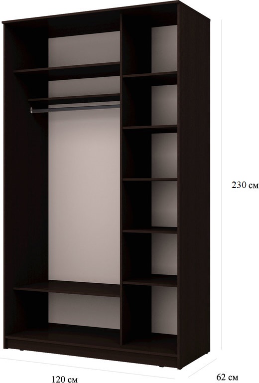 Отдельно стоящий двухдверный шкаф-купе ХИТ 23-12-11 состоит из двух секций: правая — с пятью полками, левая — с тремя полками и штангой. Ширина правой секции — 450мм