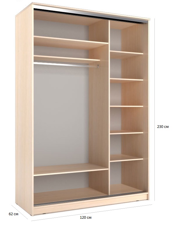 Отдельно стоящий двухдверный шкаф-купе с двумя зеркалами ХИТ 23-12-55 состоит из двух секций: правая — с пятью полками, левая — с тремя полками и штангой. Ширина правой секции — 450мм.
