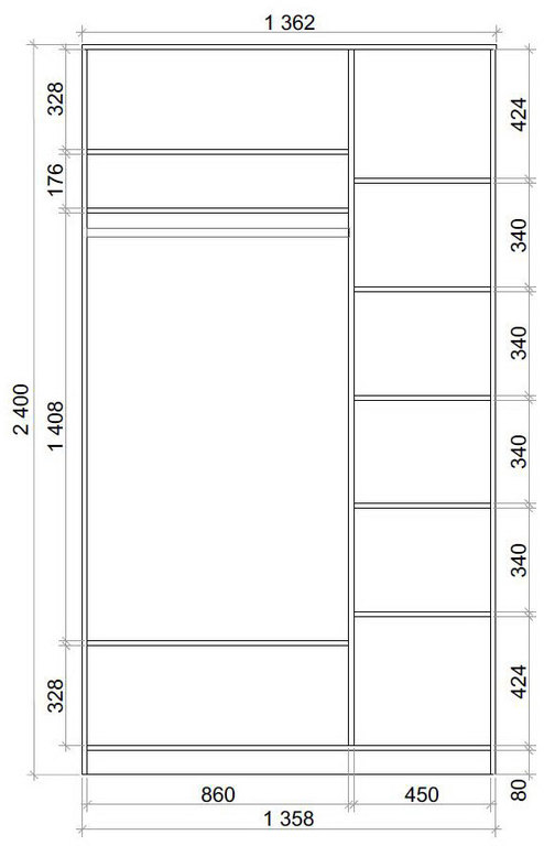 Отдельно стоящий двухдверный шкаф-купе с фотопечатью ХИТ 23-12-77 состоит из двух секций: правая — с пятью полками, левая — с тремя полками и штангой. Ширина правой секции — 450мм.
