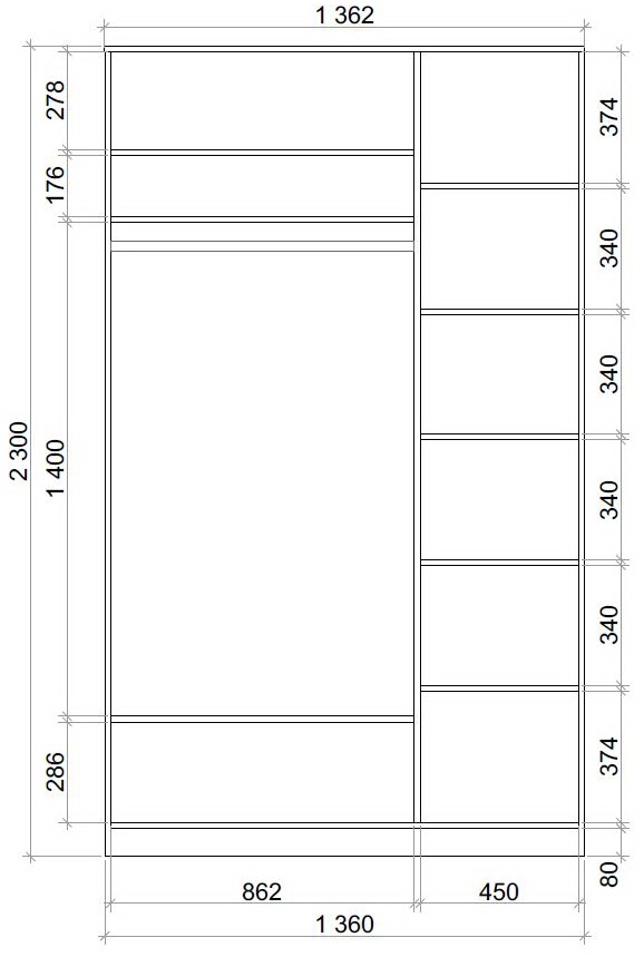 Отдельно стоящий двухдверный шкаф-купе с фотопечатью ХИТ 23-14-77 состоит из двух секций: правая с пятью полками, левая — с тремя полками и штангой. Ширина правой секции — 450мм.