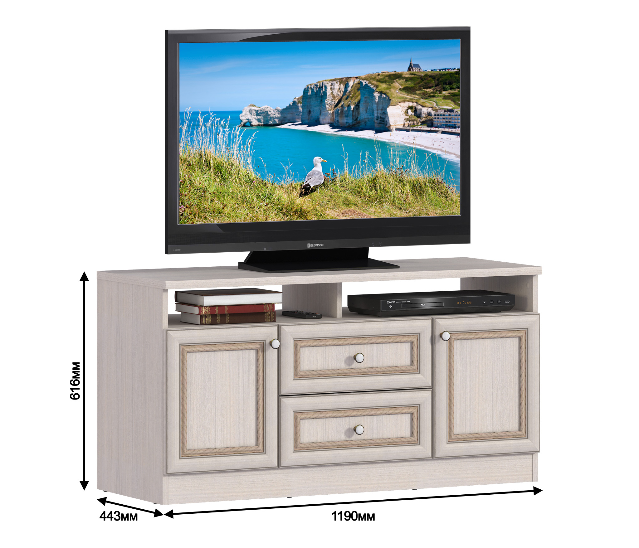 Тумба под телевизор Грация СБ-2851 – может быть стилизована в модульном гарнитуре Грация, а может быть автономным предметом мебели в прихожей, гостиной, кабинете или детской. Габаритные размеры – ширина 119 см, высота 61 см и глубина 44 см. Вес тумбы 44,44 кг, что даёт возможность передвигать её по усмотрению владельца. Под столешницей расположены две открытых полки, центральная секция с двумя выдвижными ящиками и симметричные отделения с полками и отдельными дверцами. Тумба выполнена в классическом дизайне из прочного современного материала – КДСП. Материал фасадных поверхностей – МДФ, цвета «Авиньон».