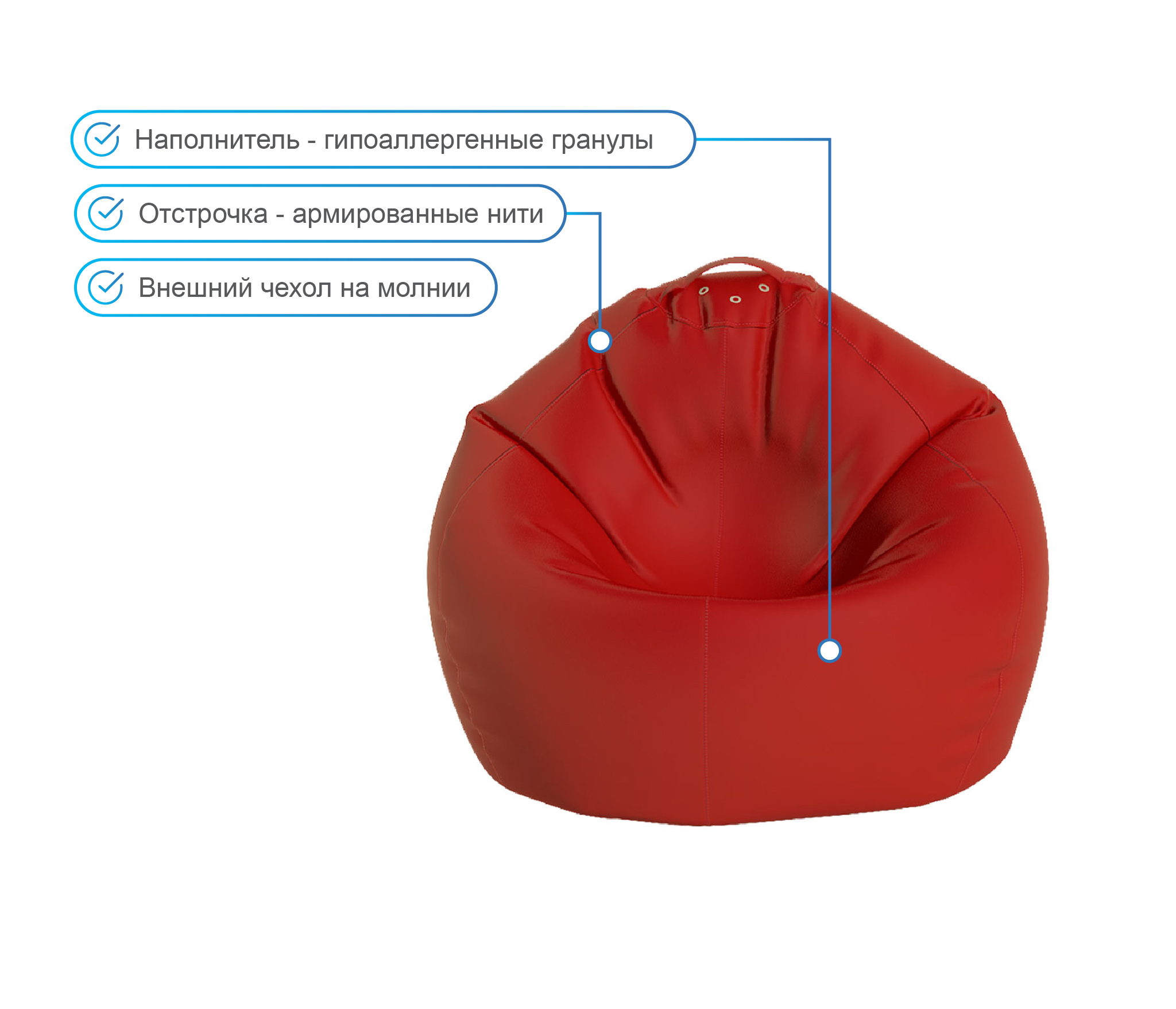 В верхнюю часть кресла, для удобства перемещения вшита ручка. Вверху модели имеются люверсы, чтобы кресло-мешок дышал . Молния на внешнем чехле достаточно длинная, вшитая в бок кресла, что позволяет легко снять чехол для стирки. Боковая молния закрыта планкой для эстетичного вида изделия. Чехлы между собой соединены с помощью липучек для правильного распределения наполнителя во время использования. Наполнителем служат гранулы пенополистирола.