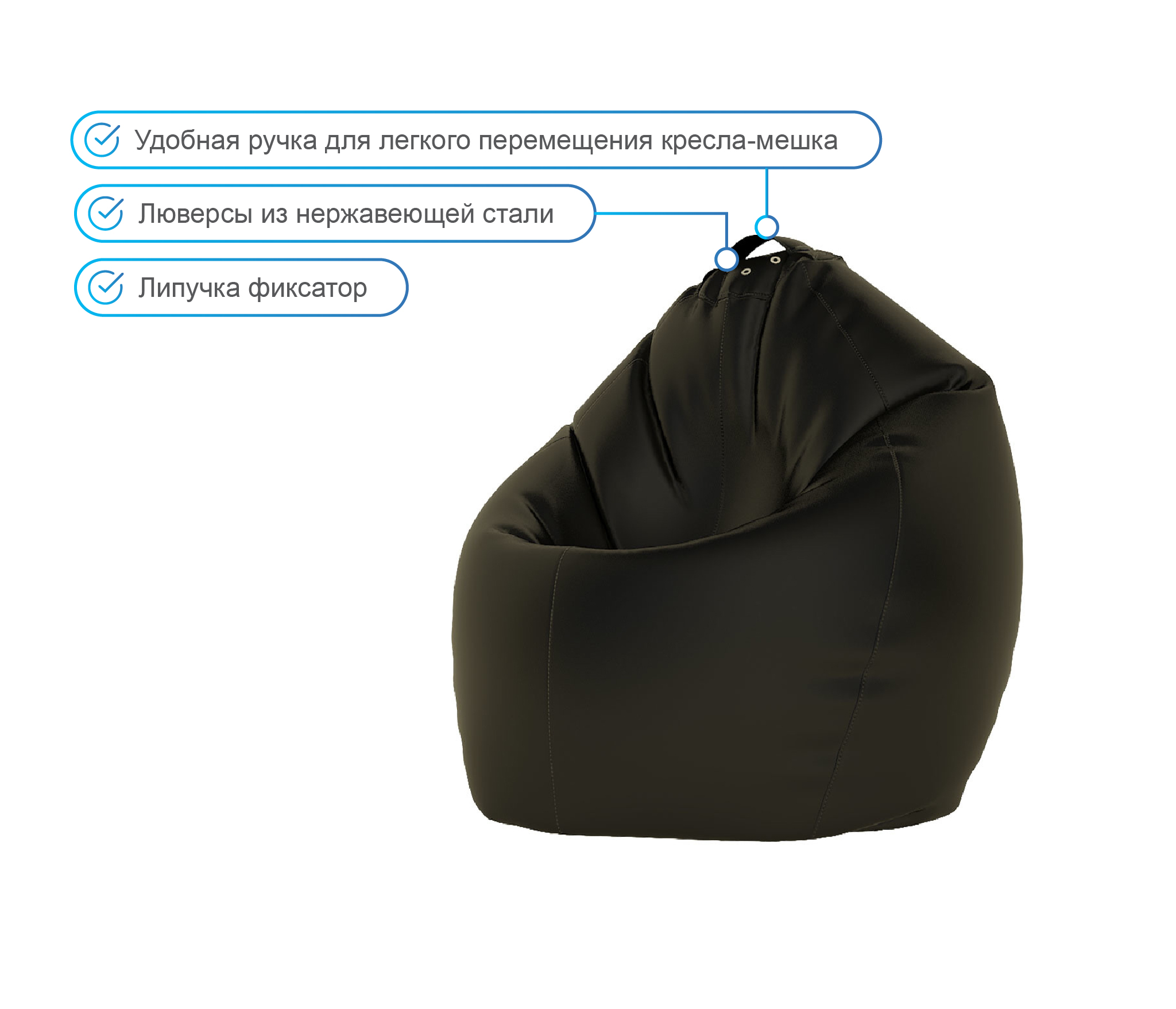 В верхнюю часть кресла, для удобства перемещения вшита ручка. Вверху модели имеются люверсы, чтобы кресло-мешок дышал . Молния на внешнем чехле достаточно длинная, вшитая в бок кресла, что позволяет легко снять чехол для стирки. Боковая молния закрыта планкой для эстетичного вида изделия. Чехлы между собой соединены с помощью липучек для правильного распределения наполнителя во время использования. Наполнителем служат гранулы пенополистирола.