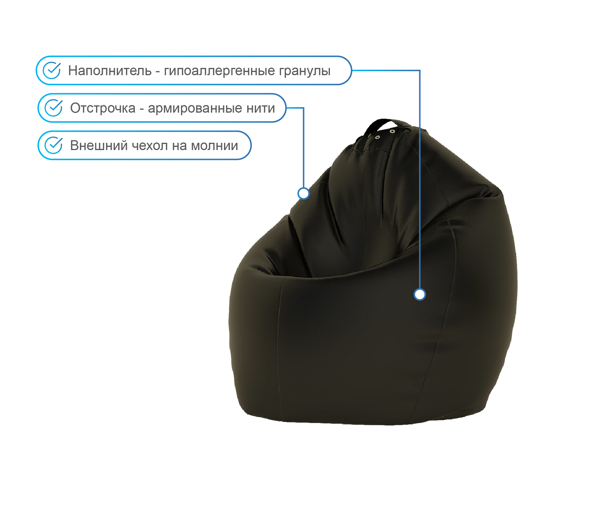 Кресло среднего размера, в форме капли, груши. Подходит как для детей, так и для взрослых. Классное и мягкое место для отдыха и работы, отличный интерьерный предмет. Имеет внутренний (для наполнителя) и внешний (декоративный) чехлы.