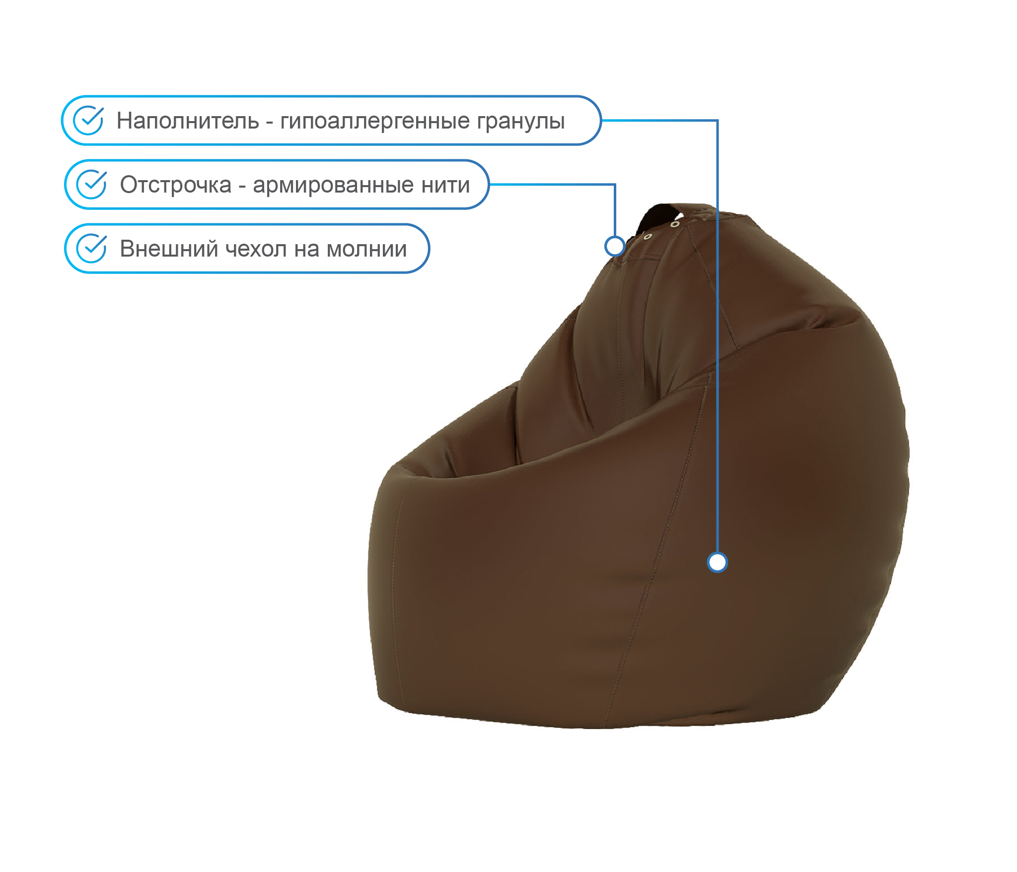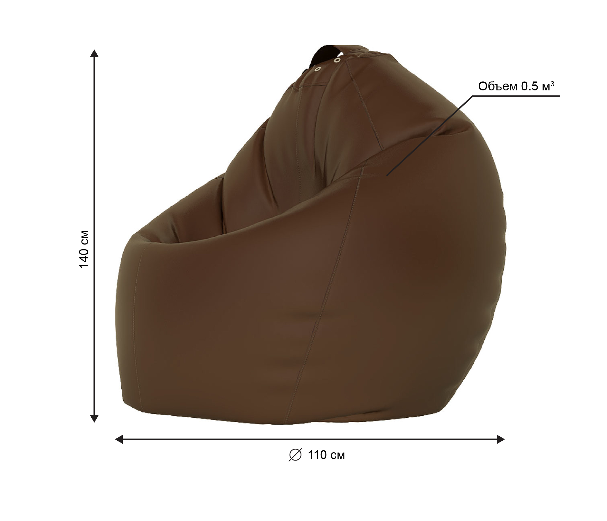 Кресло большого размера, в форме капли, груши. Отлично подходит для всех членов семьи. В кресле комфортно высокому и широкому человеку. Имеет внутренний (для наполнителя) и внешний (декоративный) чехлы.