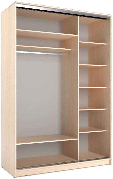 Отдельно стоящий двухдверный шкаф-купе с фотопечатью ХИТ 23-17-77 состоит из двух секций: правая — с пятью полками, левая — с тремя полками и штангой. Ширина правой секции — 450мм.