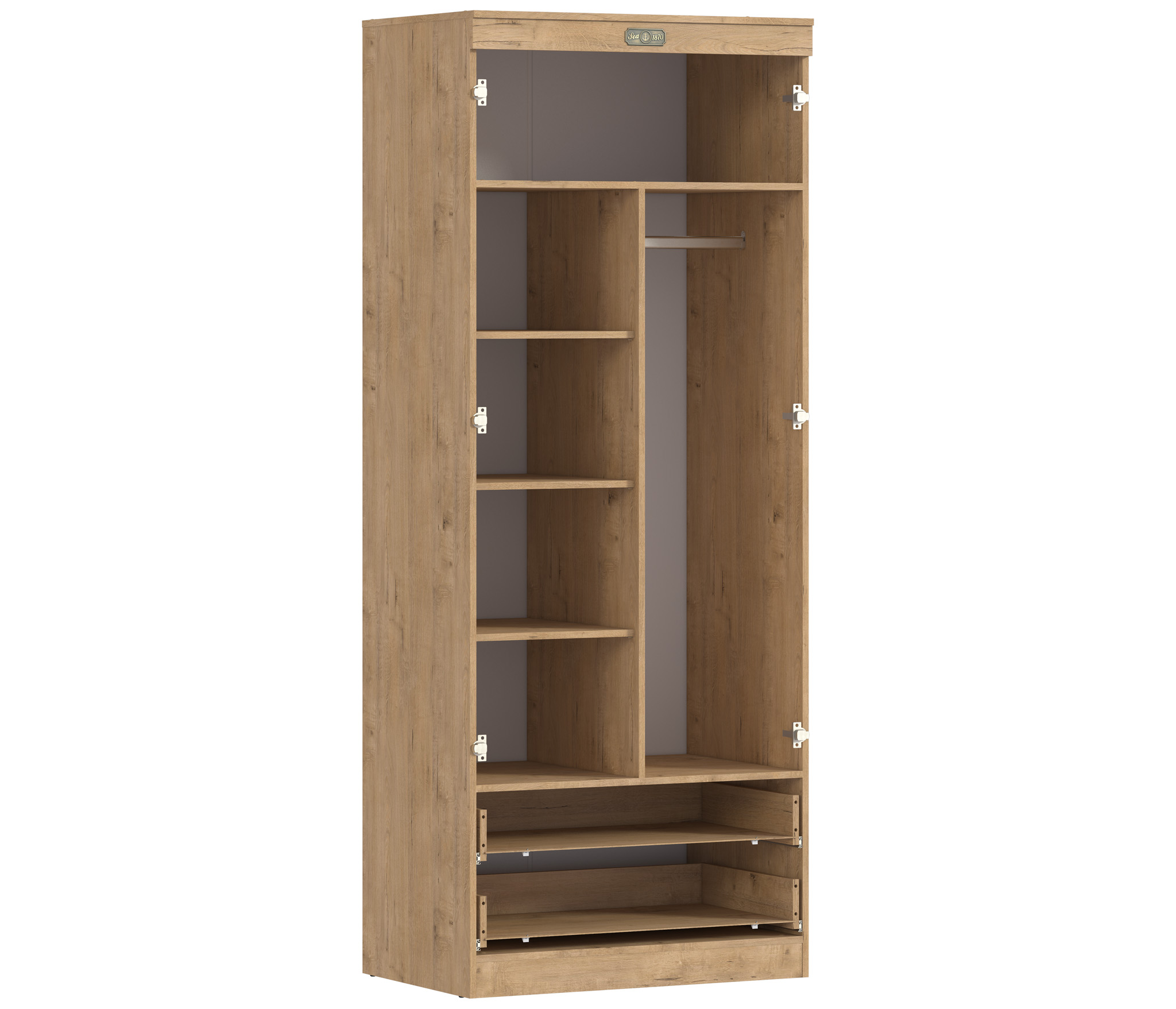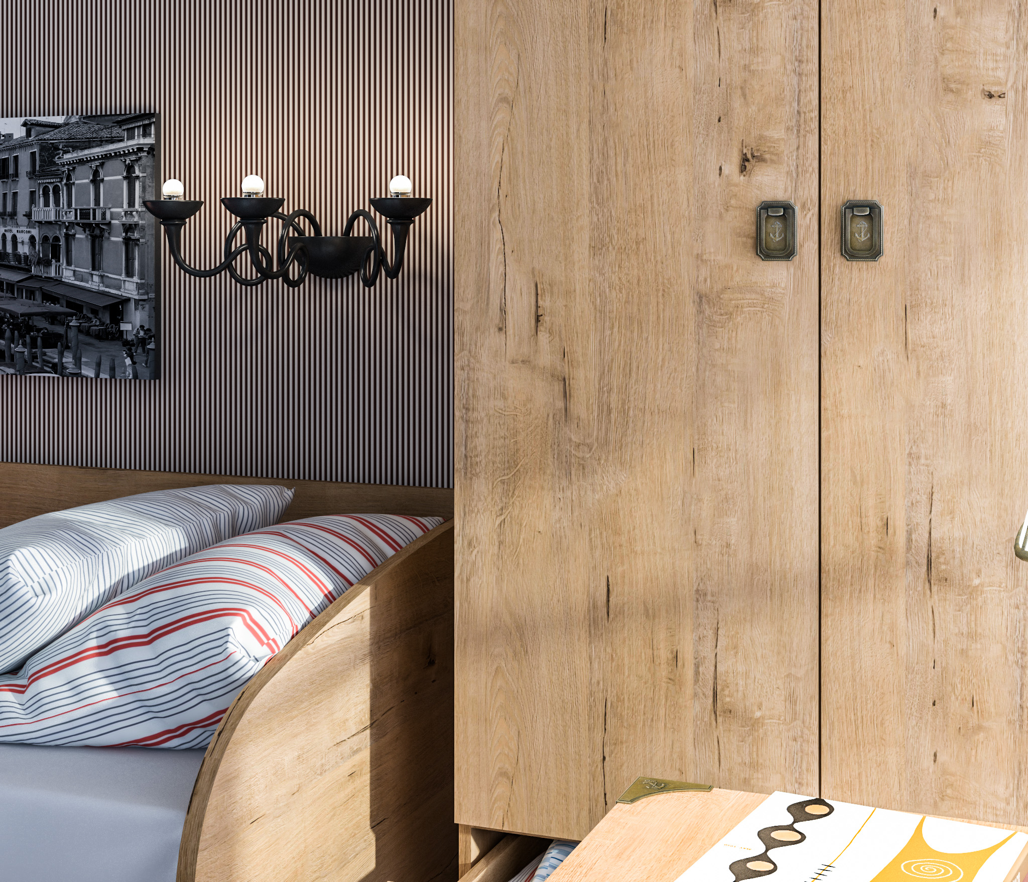 Габаритные размеры шкафа Фрегат – ширина 88 см, высота 222 см и глубина 57 см. Визуально шкаф можно разделить на два отделения. В верхнем плательном отделении есть отсек со штангой для размещения верхней одежды и отсек с четырьмя вместительными полками. Оба отделения объединены под одной антресолью. Под плательным отделением находятся два больших выдвижных ящика.Шкаф Фрегат выполнен из прочного современного КДСП в морской стилистике. Цвет отделки – «Дуб Бунратти». Материал отделки устойчив к мелким механическим повреждениям и влаге.