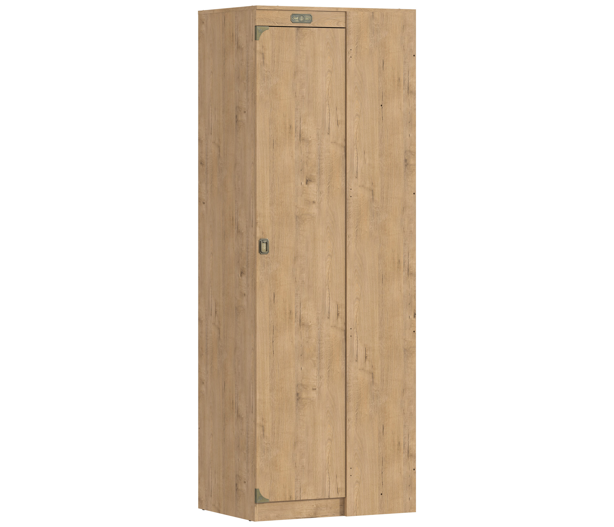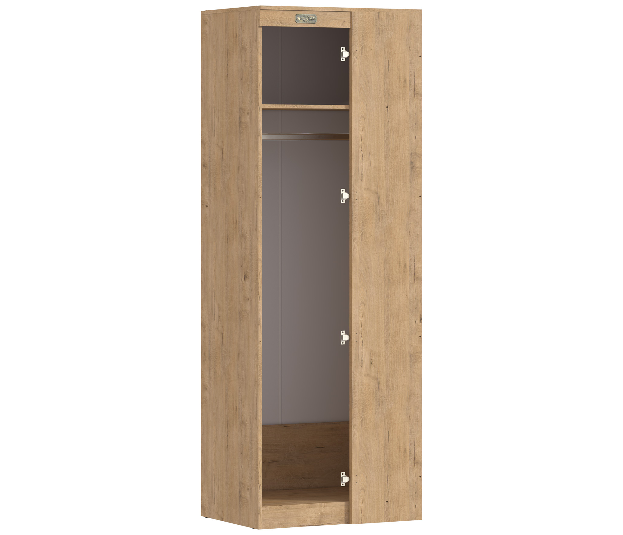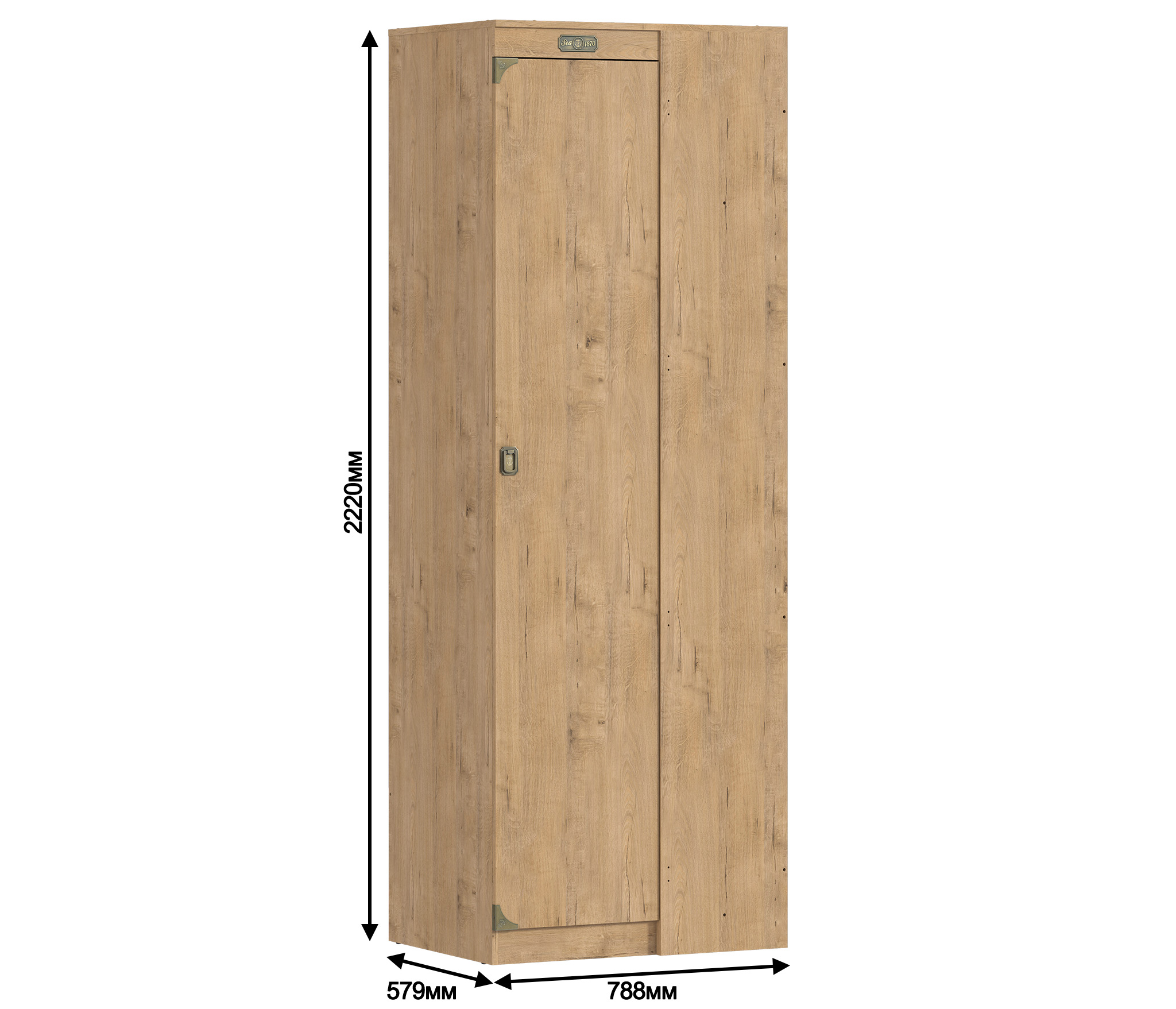 Габаритные размеры – ширина 78 см. высота 222 см, глубина 57 см. Шкаф имеет одно очень вместительное отделение со штангой для развешивания верхней одежды. Сверху расположена антресоль.Шкаф Фрегат выполнен в морской стилистике из прочного современного КДСП. Цвет отделки «Дуб Бунратти». Материал отделки устойчив к влаге.