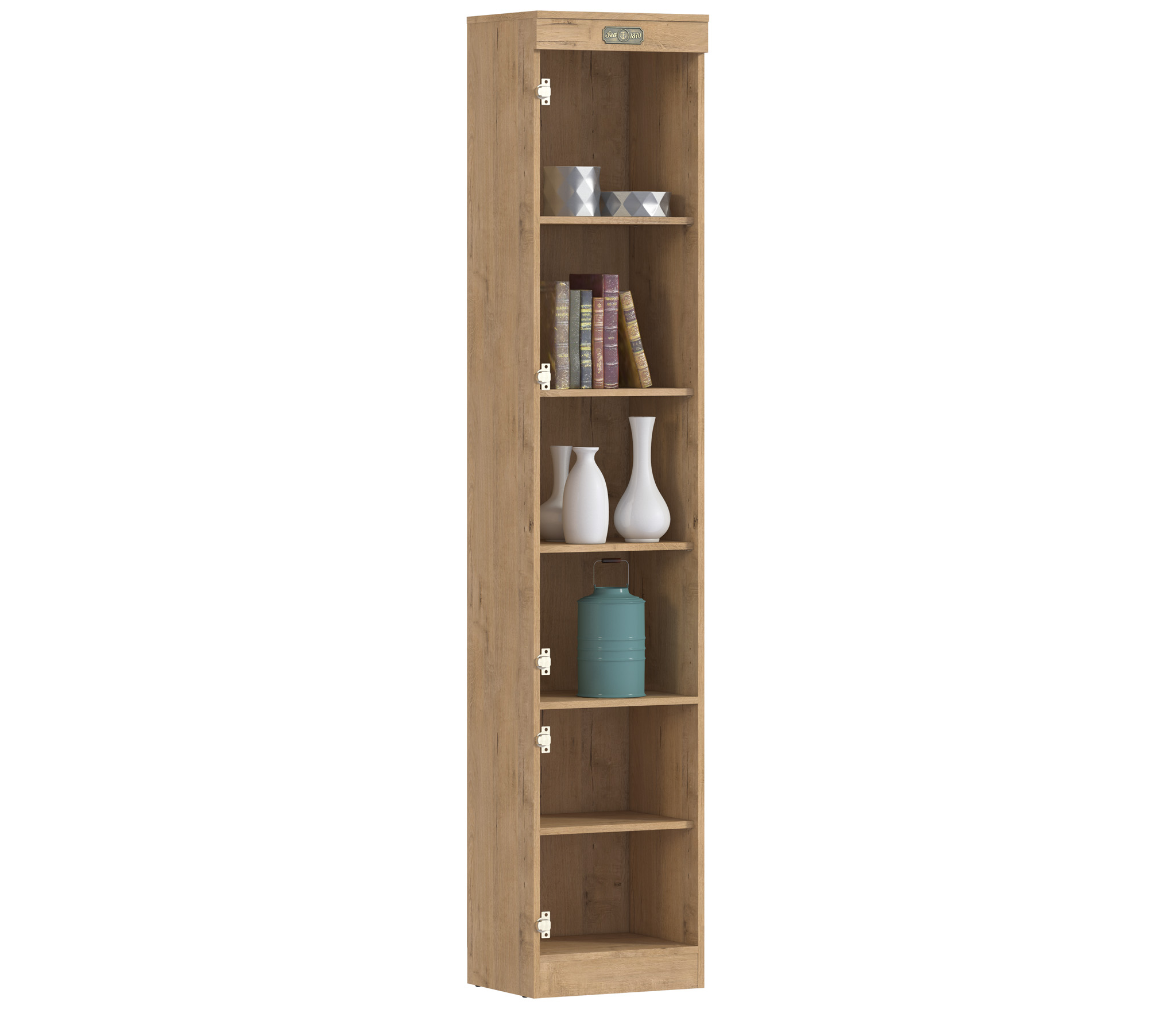 Габаритные размеры витрины – ширина 44 см, высота 222 см и глубина 35 см. В верхней части за стеклянной дверцей располагается отделение с четырьмя полками. В нижней части - отделение с двумя полками за глухой дверцей.Витрина Фрегат выполнена в морской стилистике из прочного современного КДСП. Цвет отделки «Дуб Бунратти». Витрина может использоваться как отдельный предмет мебели, так и в сочетании с другими элементами из коллекции Фрегат.