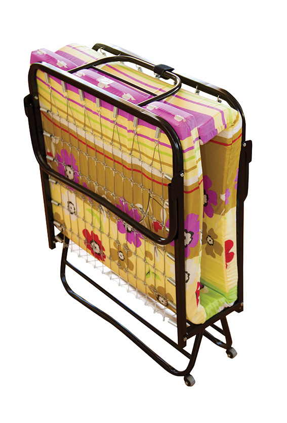 Благодаря 2 колесам раскладушку легко передвигать. Металлический замок фиксирует в сложенном состоянии.