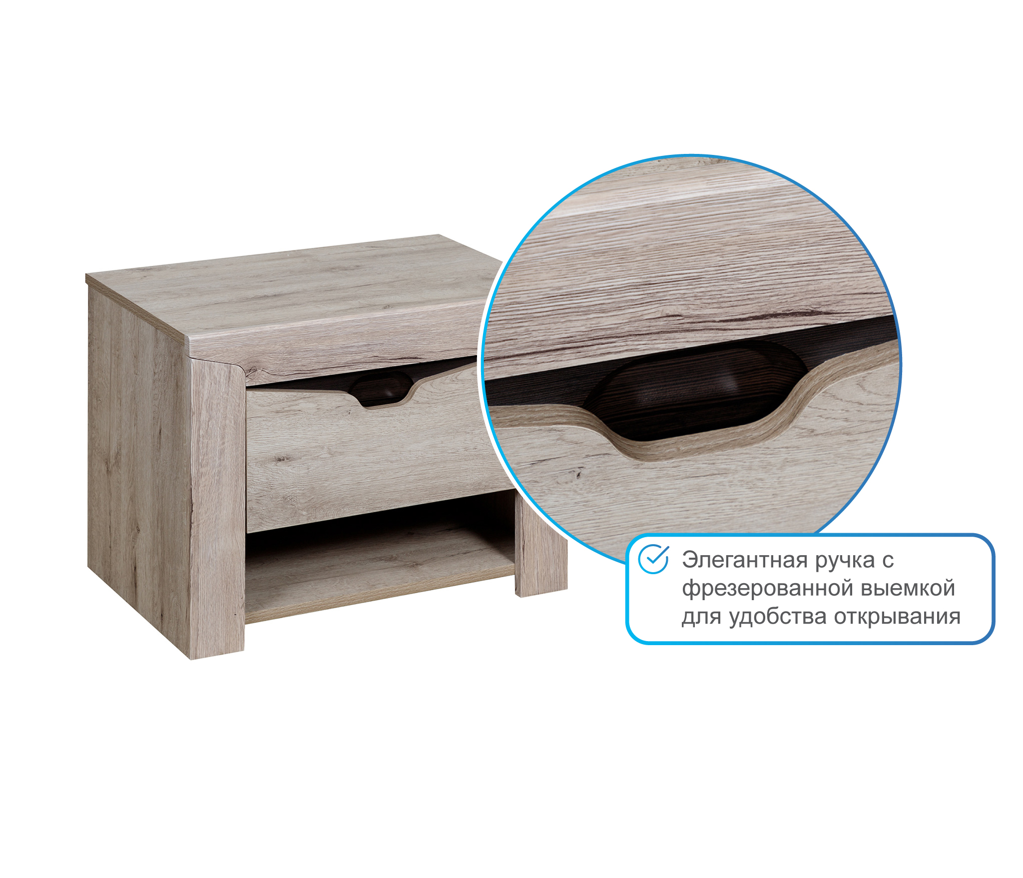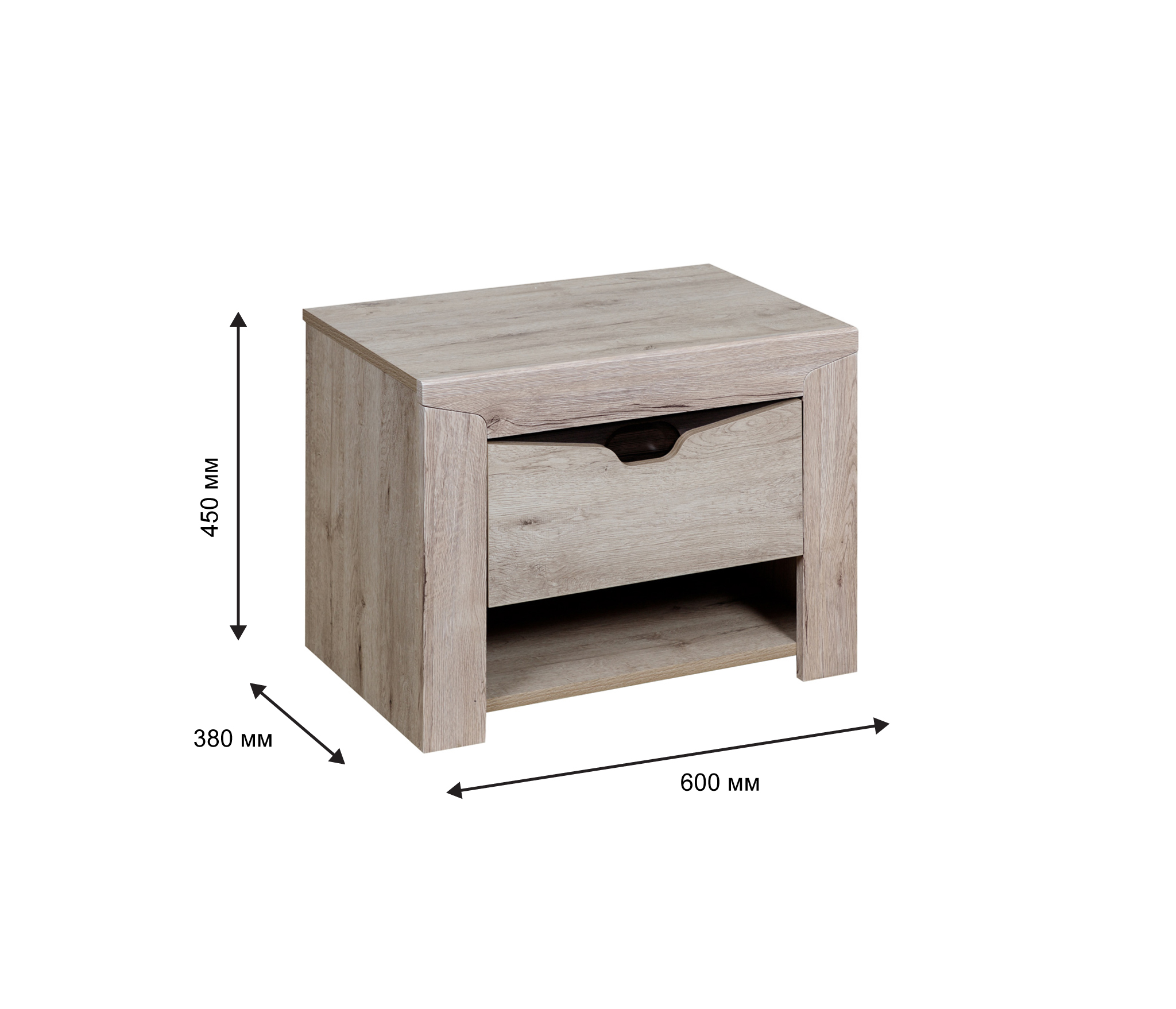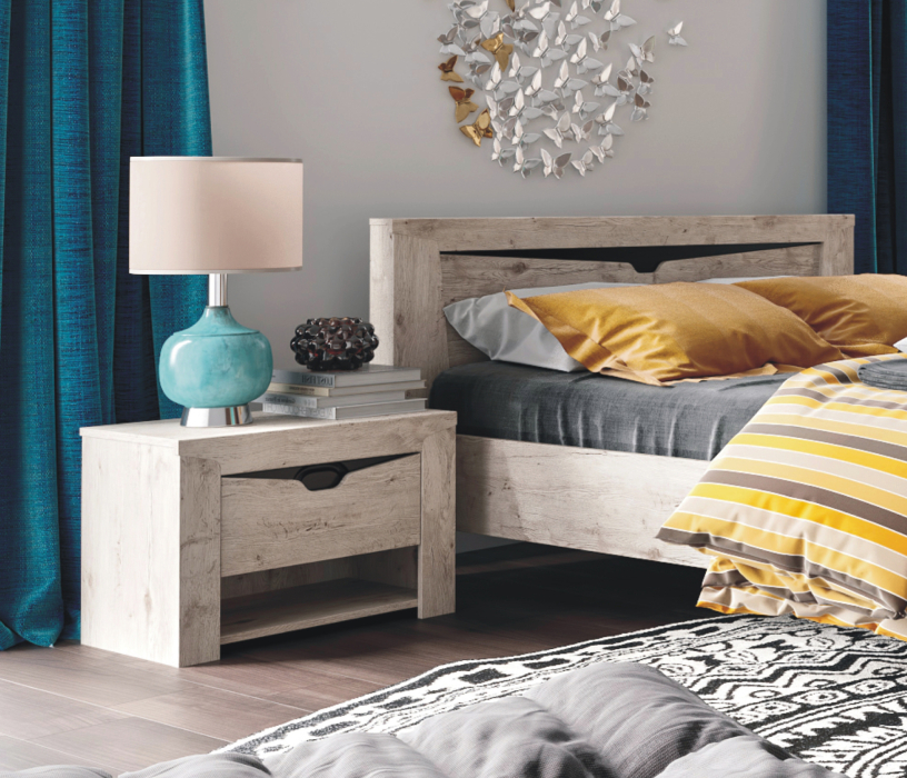 Прикроватная тумба Сорренто — мебель и функциональная, и стильная. Она выполнена в модном цвете натурального дуба, отлично сочетается с другой мебелью одноименной коллекции. Модель достаточно вместительная, в двух отделениях и на поверхности можно найти место множеству мелочей. Особый шарм изделия заключен в выдвижном ящике, верхняя часть которого имеет экстравагантный вырез и темную ручку. Эта тумбочка устойчива и не будет покачиваться от неосторожного движения, что особенно важно, если там стоит стакан с водой или хрупкие предметы.