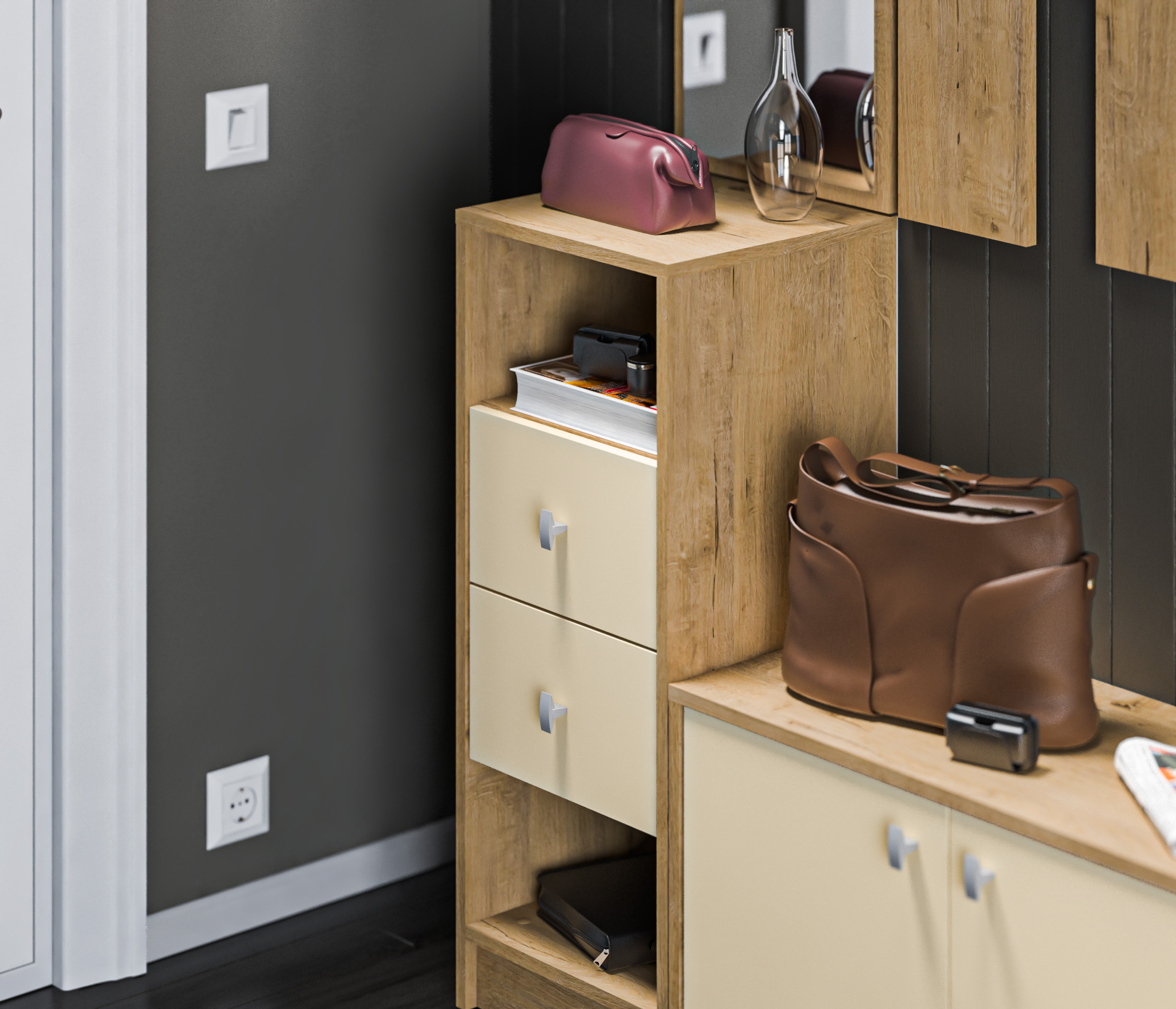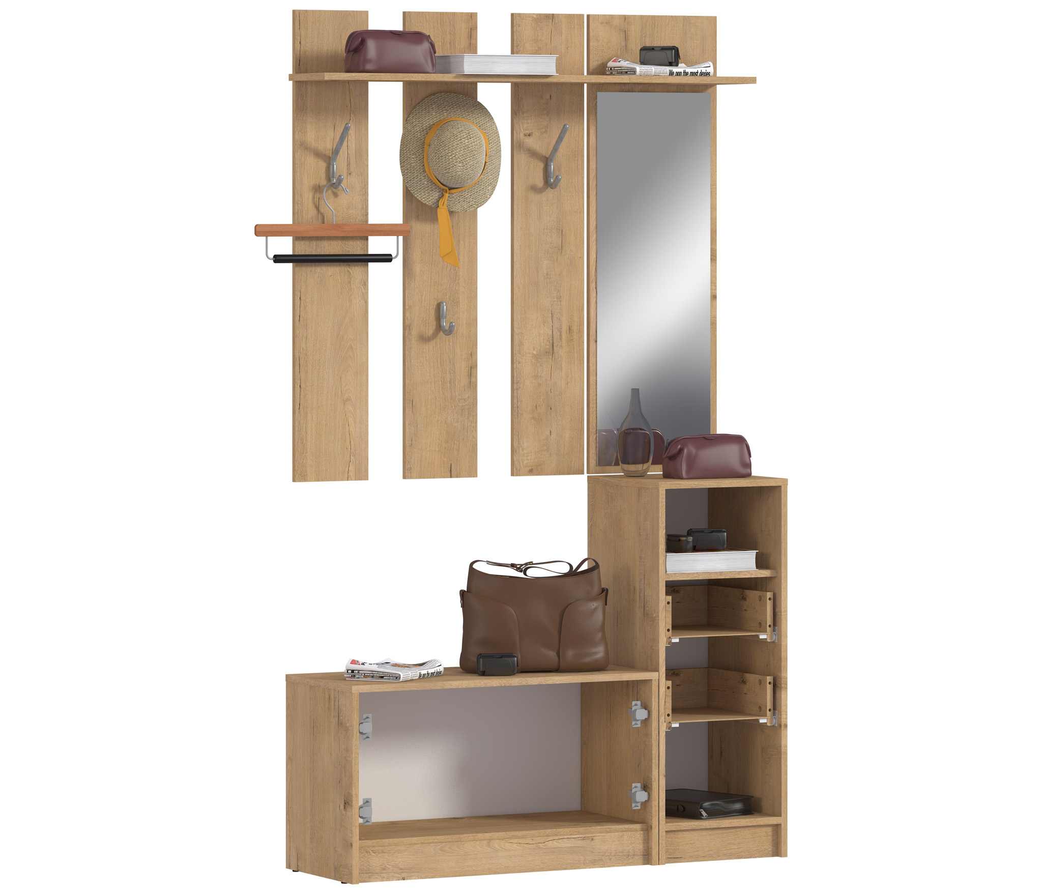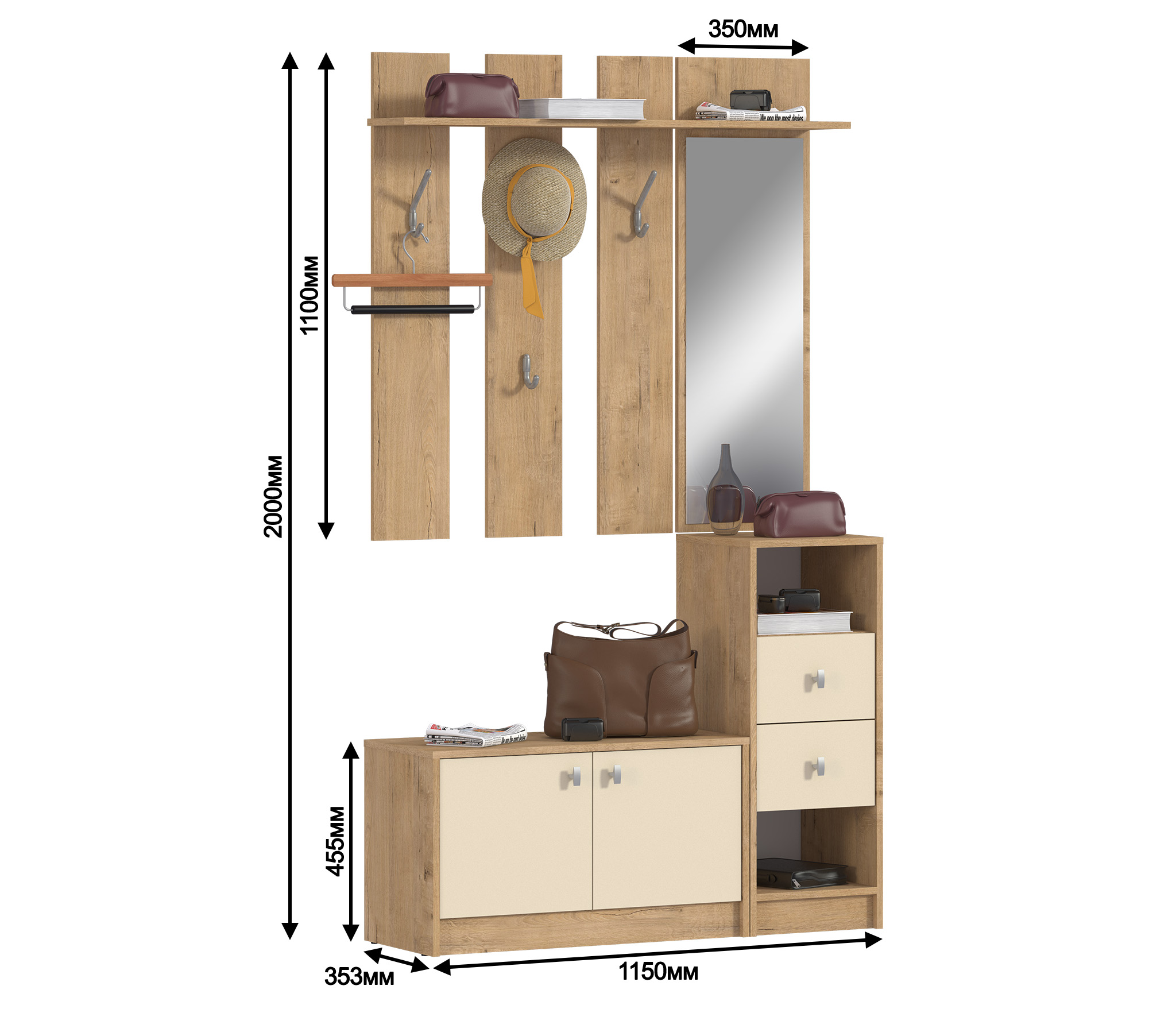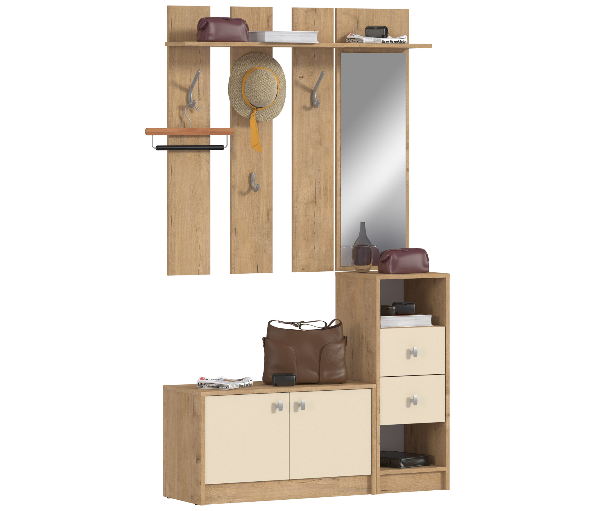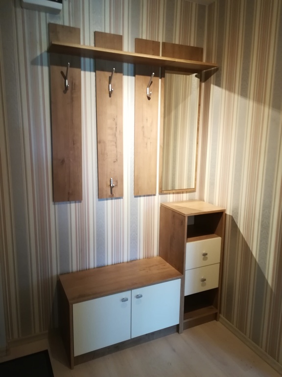 Подбирали эту прихожую в комплект к шкафу-купе Экспресс. Цвет шкафа взяли дуб сонома. Получилось идеально, как на заказ. В целом очень довольны покупкой. В начале был запах, но он довольно быстро выветрился. Из минусов: плохая фурнитура: очень хилые направляющие, петли без доводчиков, ручки и крючки пластиковые. Но при такой цене не обидно) так что если это принципиально, лучше заранее самим приобрести хорошую фурнитуру. Так как в тумбочке нет перегородки, лучше на нее не садиться. И, на мой взгляд, в тумбочке не хватает полочки, чтобы больше обуви вместить. В целом, хороший комплект.