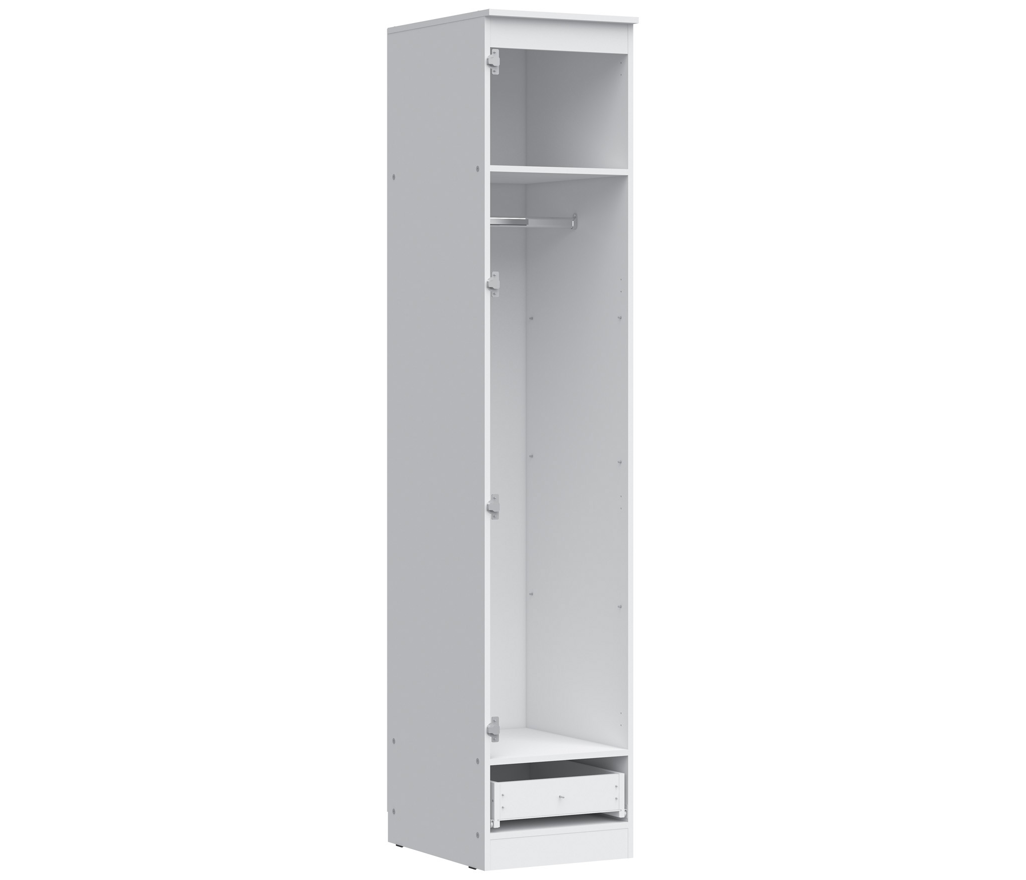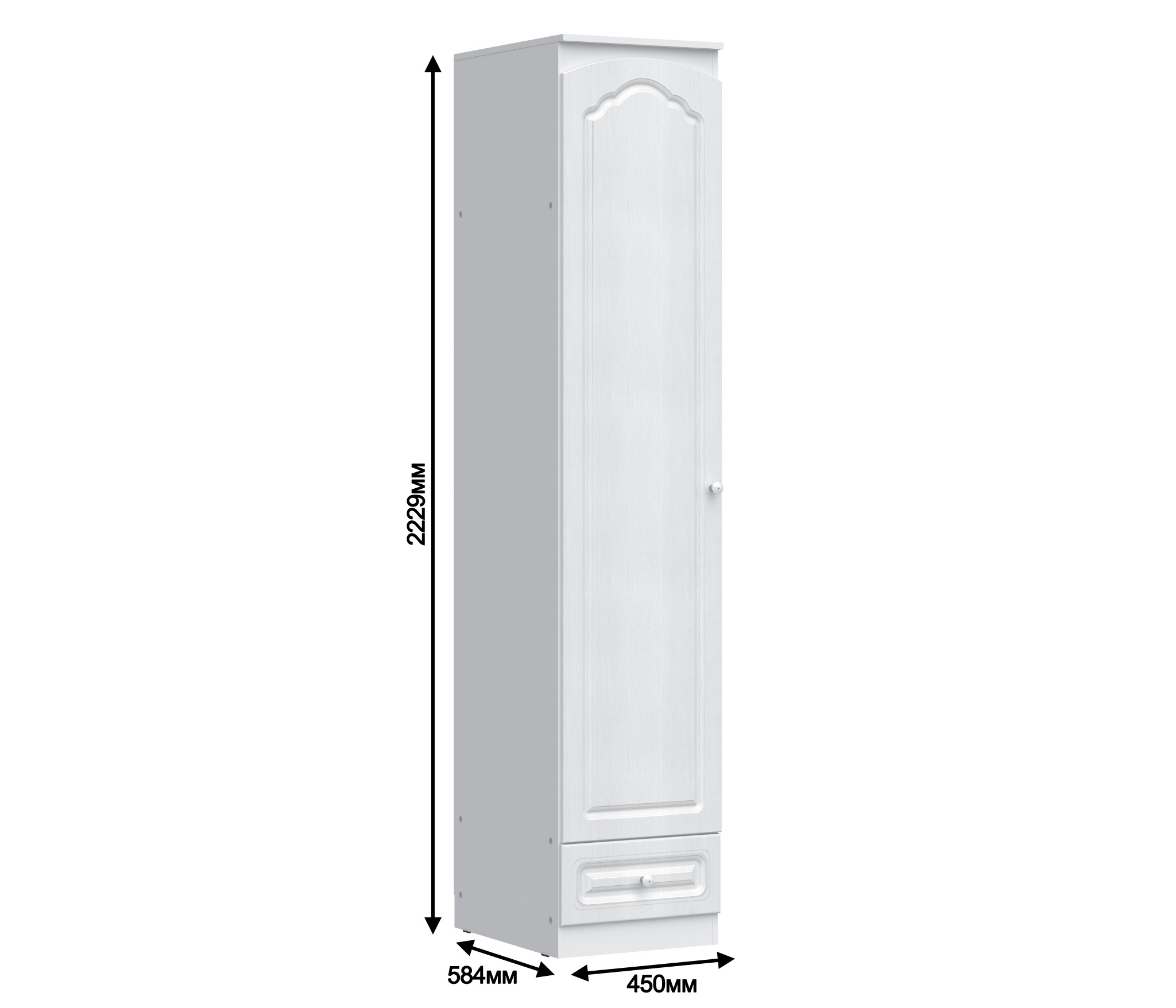 Высокий одностворчатый шкаф. С ним будет легко навести порядок. Он выполнен из качественных и надежных материалов. Приятное дополнение – выдвижной ящик с миниатюрной круглой ручкой.