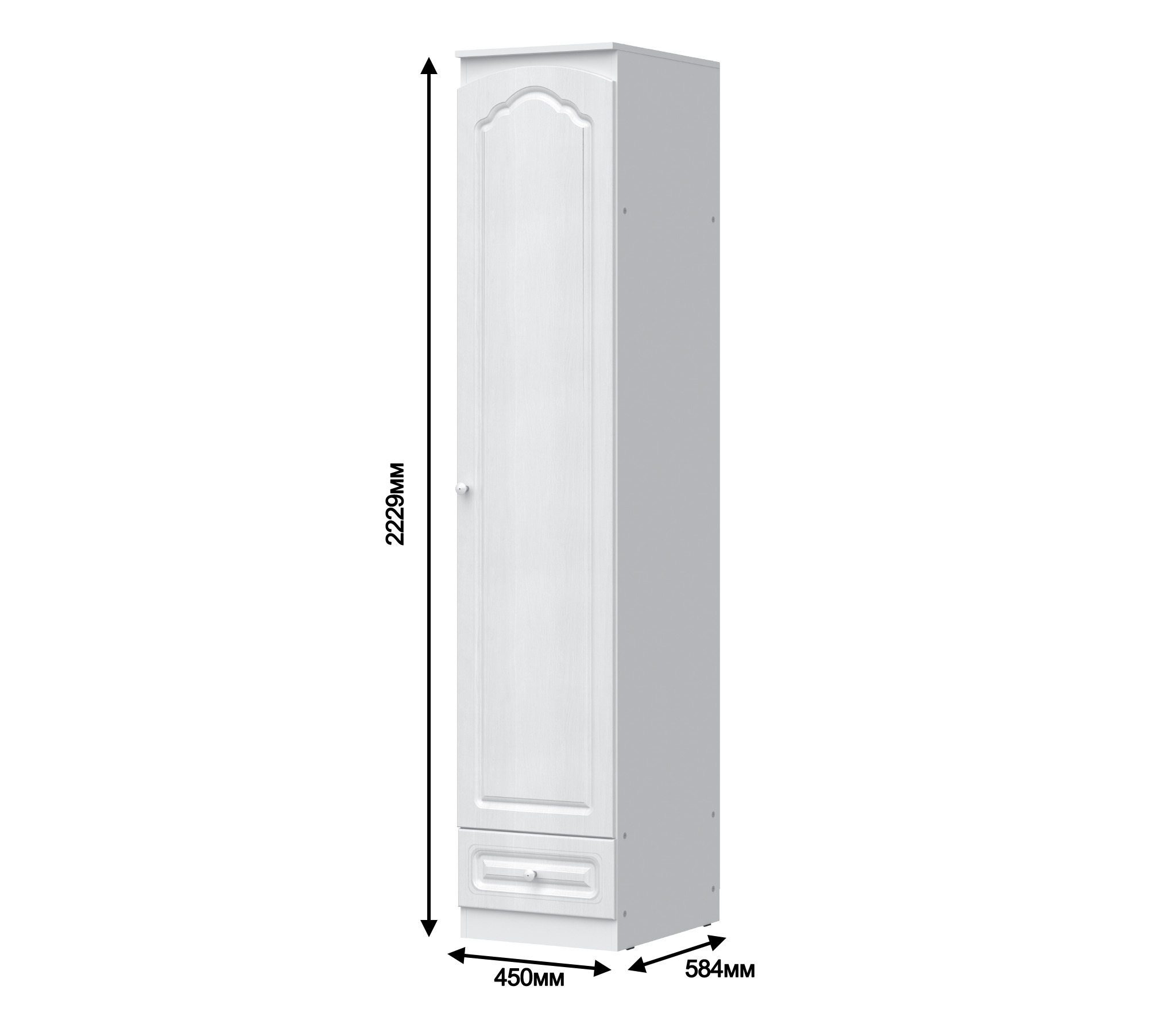 Правый 1-дверный шкаф «Амалия СБ-986» поможет организовать гардероб в маленькой спальне. Компактность модели скрывает за собой удивительную практичность: к вашим услугам нижний выдвижной ящик, просторная секция со штангой для вешалок и верхняя вместительная полка. Благодаря прочности материалов конструкция легко выдержит даже внушительный вес. Светлый оттенок «Дуб беленый» превращает шкаф в стильный акцент обстановки. Осторожная рельефность фасадов в сочетании с круглыми ручками не отвлекает на себя внимание и одновременно подчеркивает изысканность модели «Амалия СБ-986».