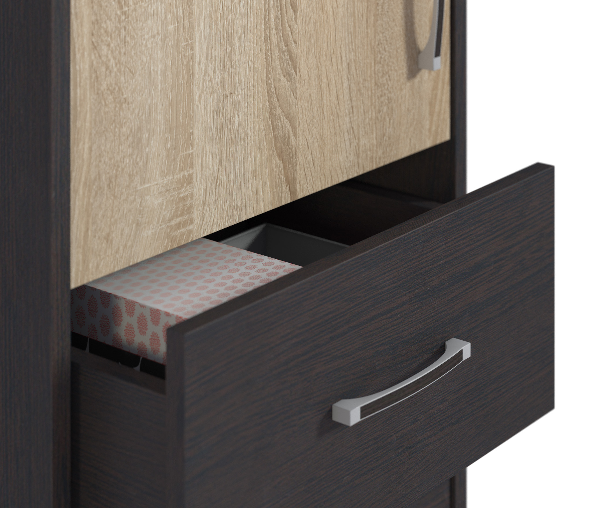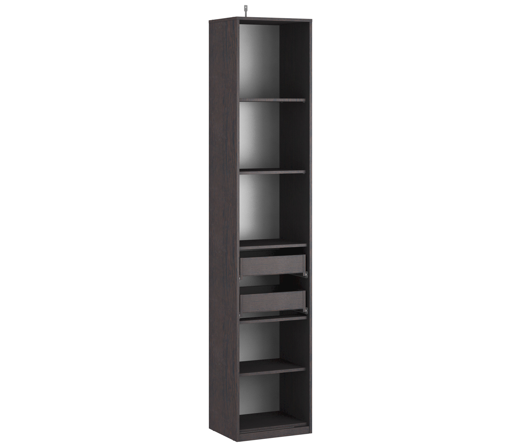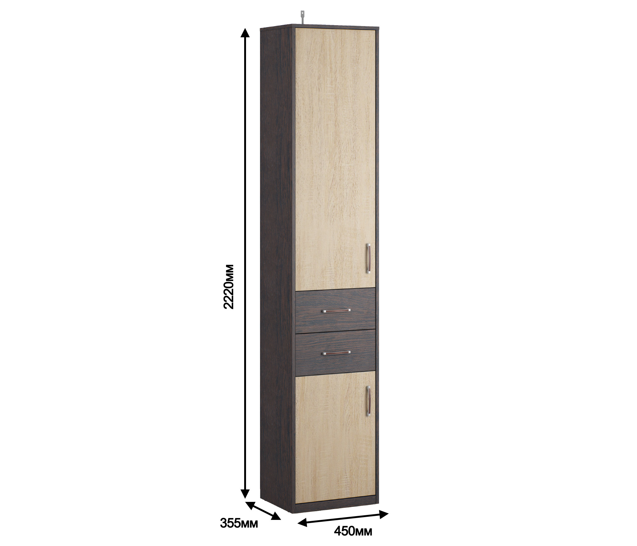 При скромных габаритных размерах – ширина 45 см, высота 222 см и глубина 35 см, шкаф справится с вопросом, связанным с хранением вещей. Визуально шкаф делится на три отделения. Верхнее и нижнее под непрозрачными дверцами, оборудованы вместительными полками. В центре расположены два вместительных выдвижных ящика. Выполнен шкаф из КДСП. Корпус облицован декоративной плёнкой цвете «Венге», отделка фасадов шкафчиков в цвете «Дуб Сонома», фасадов ящиков - в цвете «Венге»
