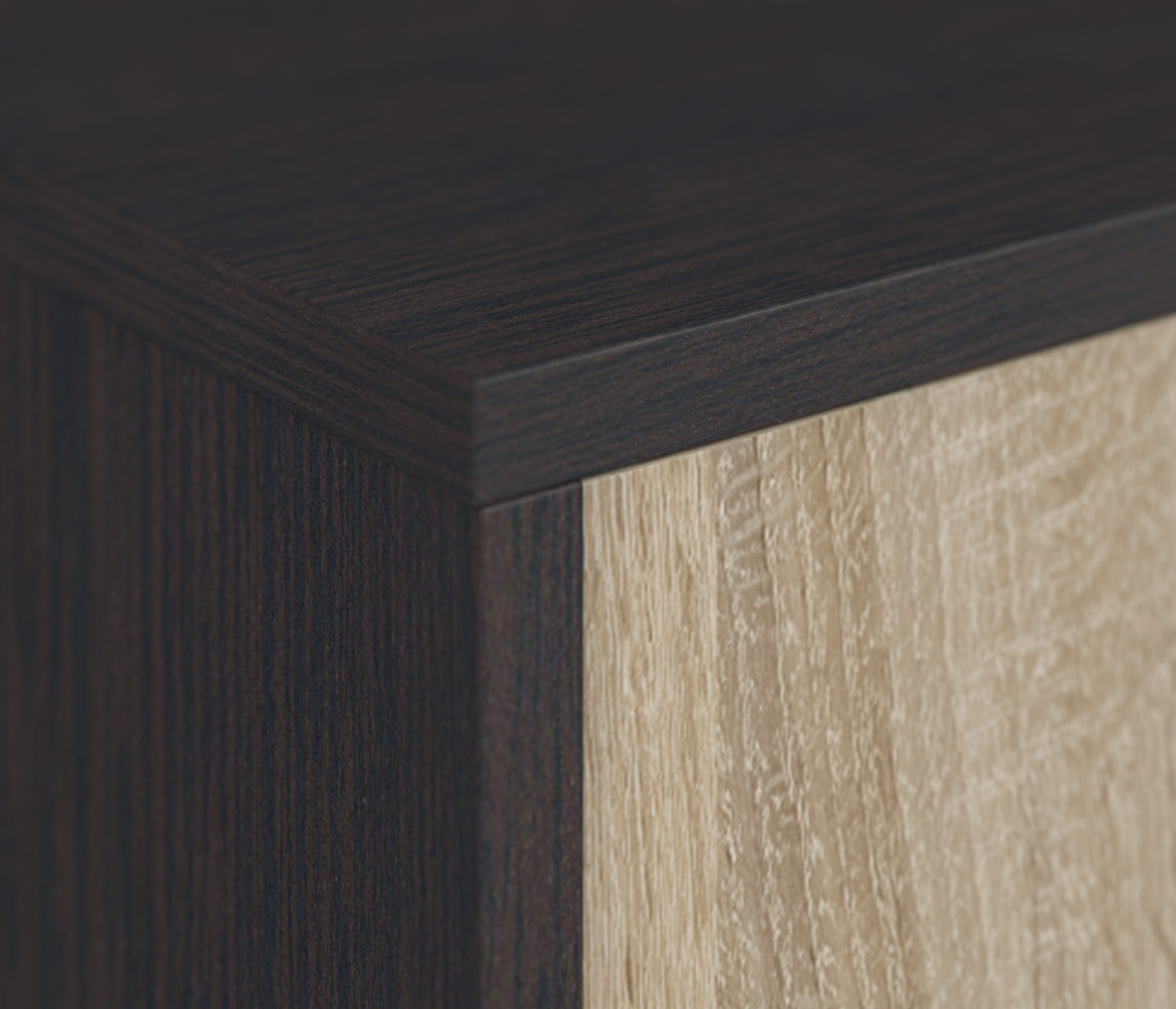 Выполнена полка из современного и прочного КДСП. Цвет оформления комбинированный. Корпус облицован пленкой в цвете «Венге». А поверхность фасадов в цвете «Дуб Сонома».