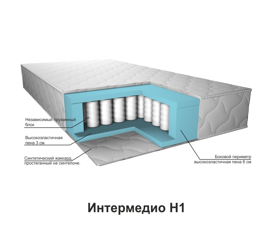 Чехол жаккард, высокоэластичная пена 30 мм спанбонд, блок независимых пружин(256 шт.кв.м.) периметр.