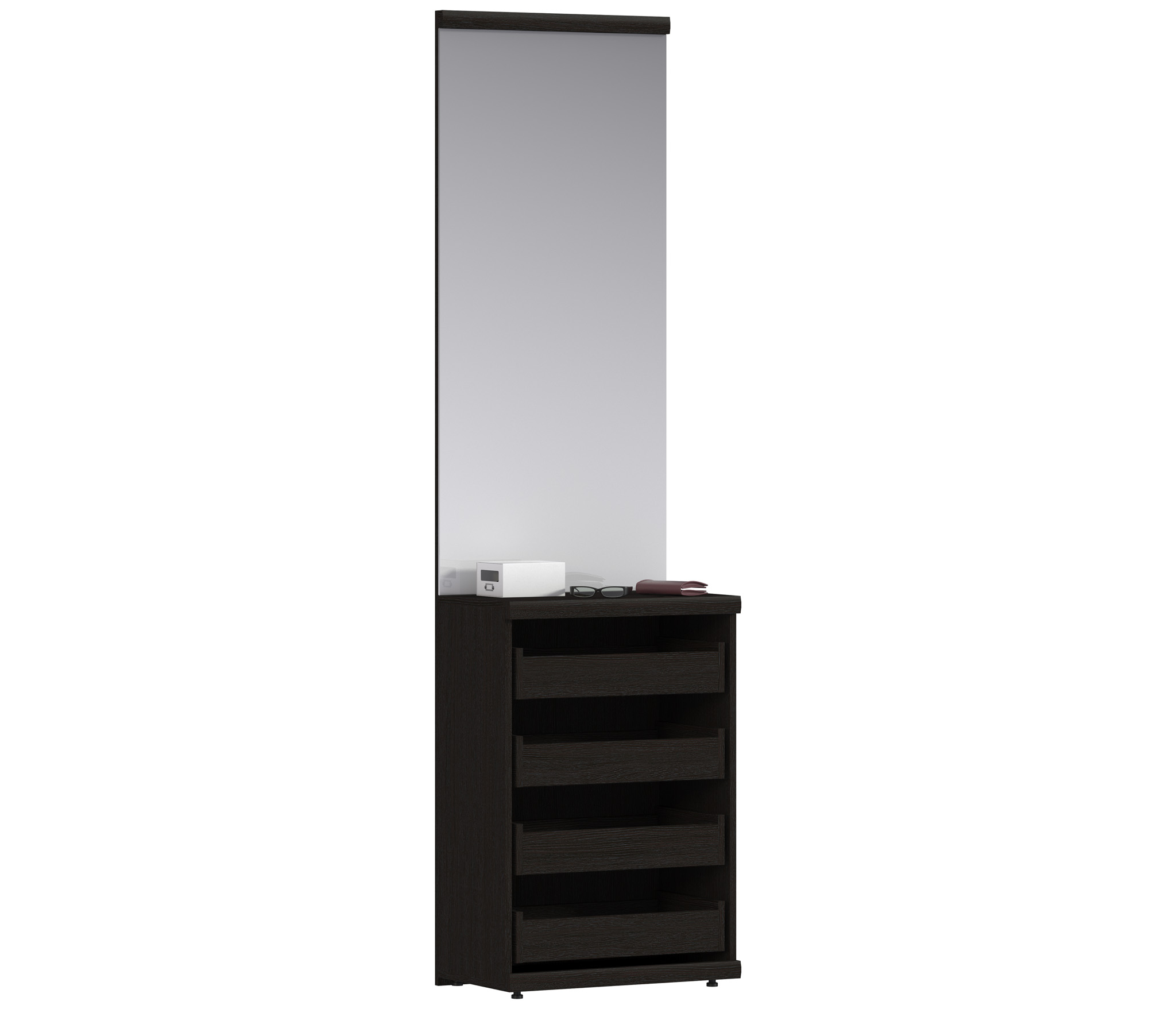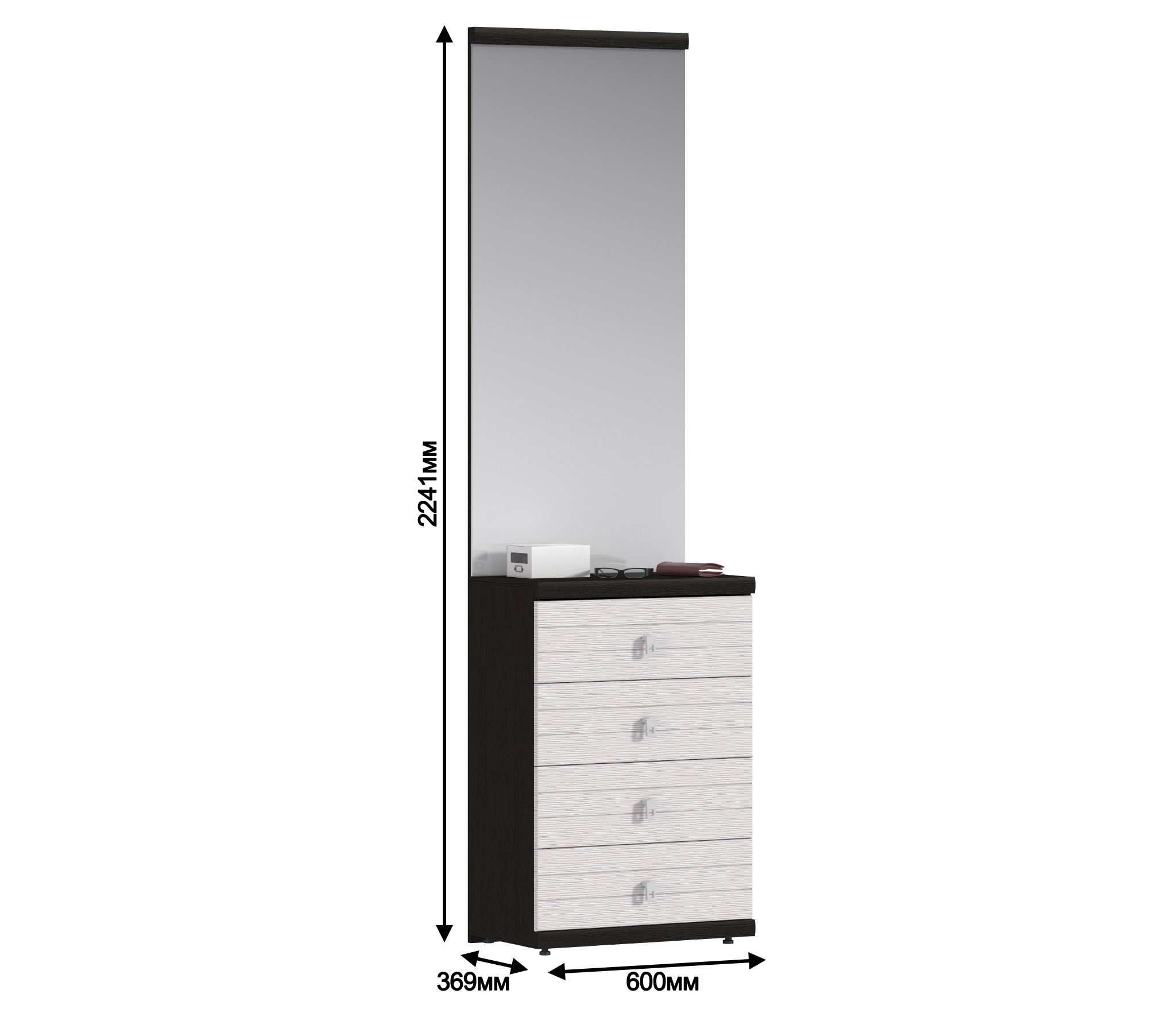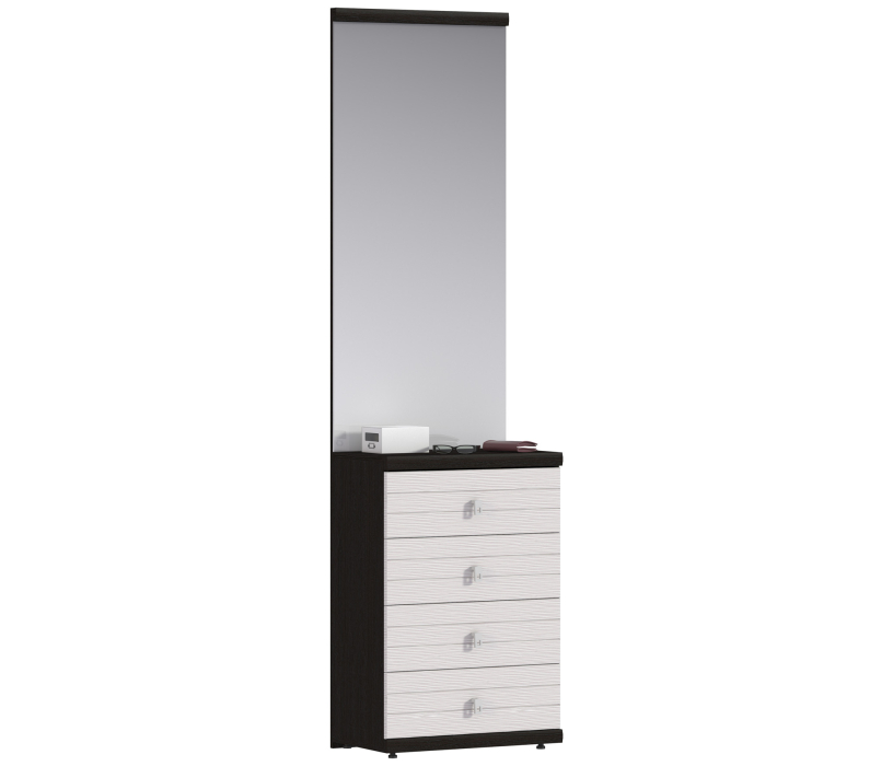 Зеркало в этой конструкции — замечательный способ визуально расширить пространство прихожей. А тумба поможет навести порядок в прихожей. В четырех глубоких ящиках тумбы можно хранить головные уборы, средства по уходу за обувью и другие вещи. Удобно и эффективно.