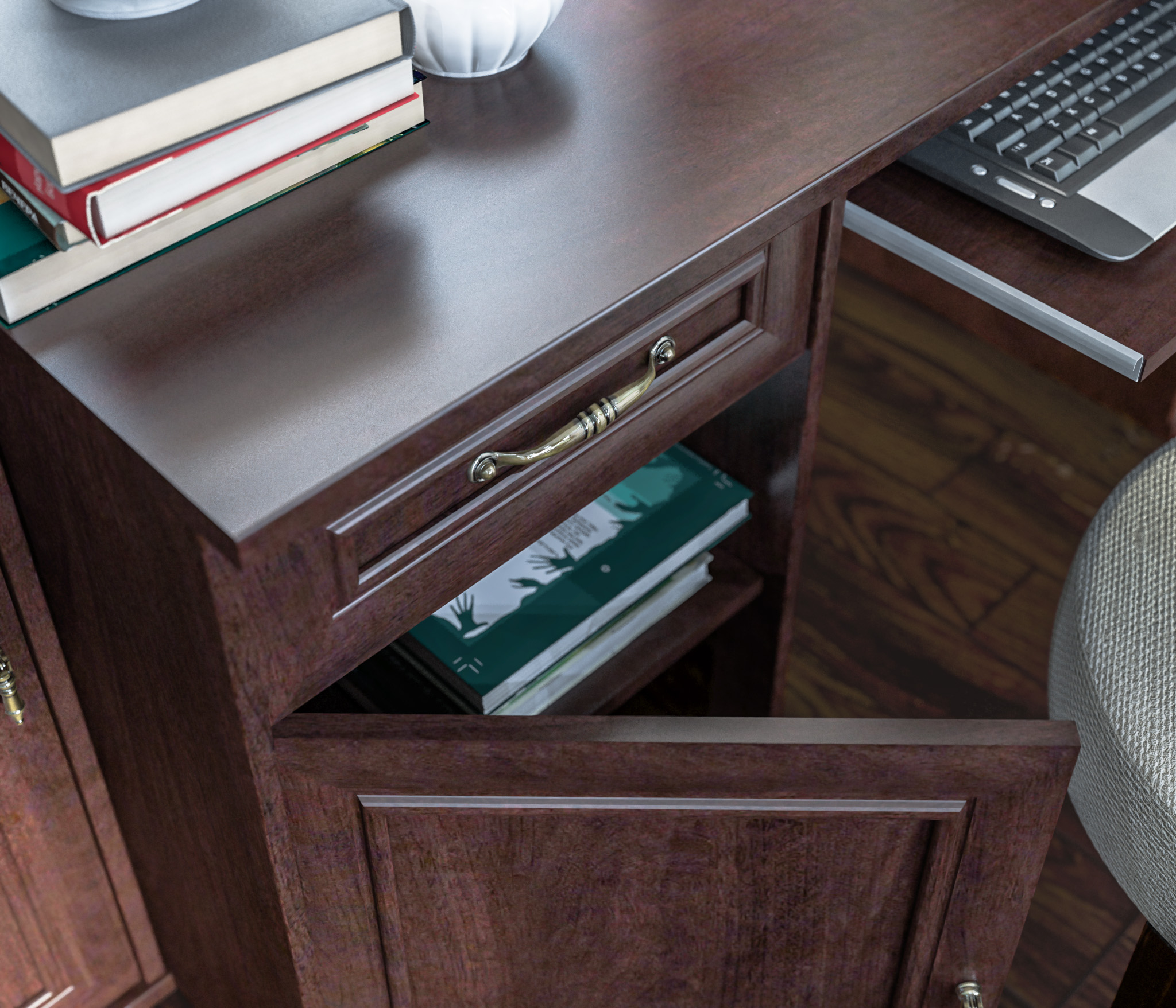 Функциональный стол для кабинета. В нем предусмотрено место для системного блока. Стол дополнен выдвижной полкой для клавиатуры и тумбой с выдвижным ящиком. Эргономичный дизайн делает работу за таким столом максимально комфортной.