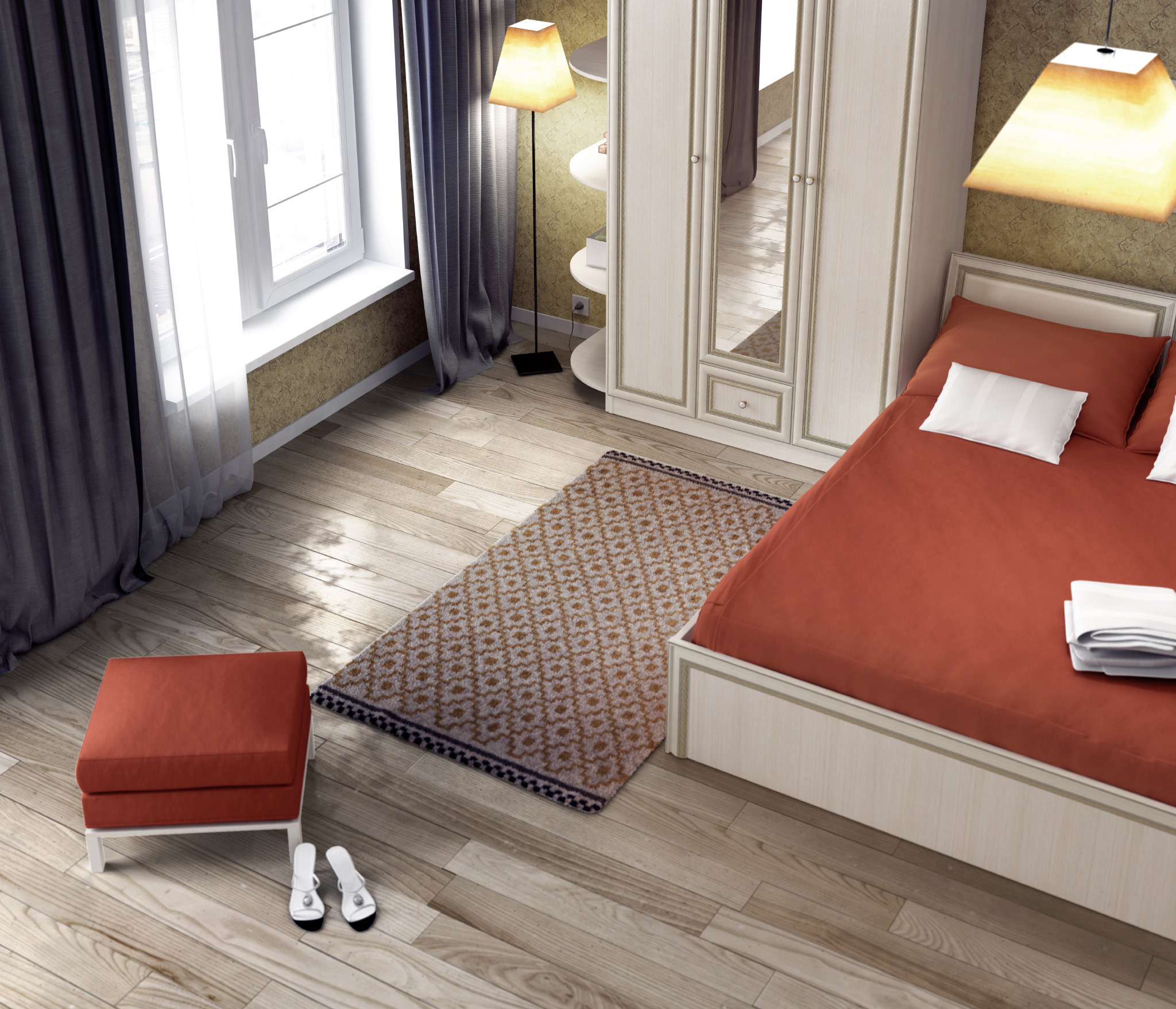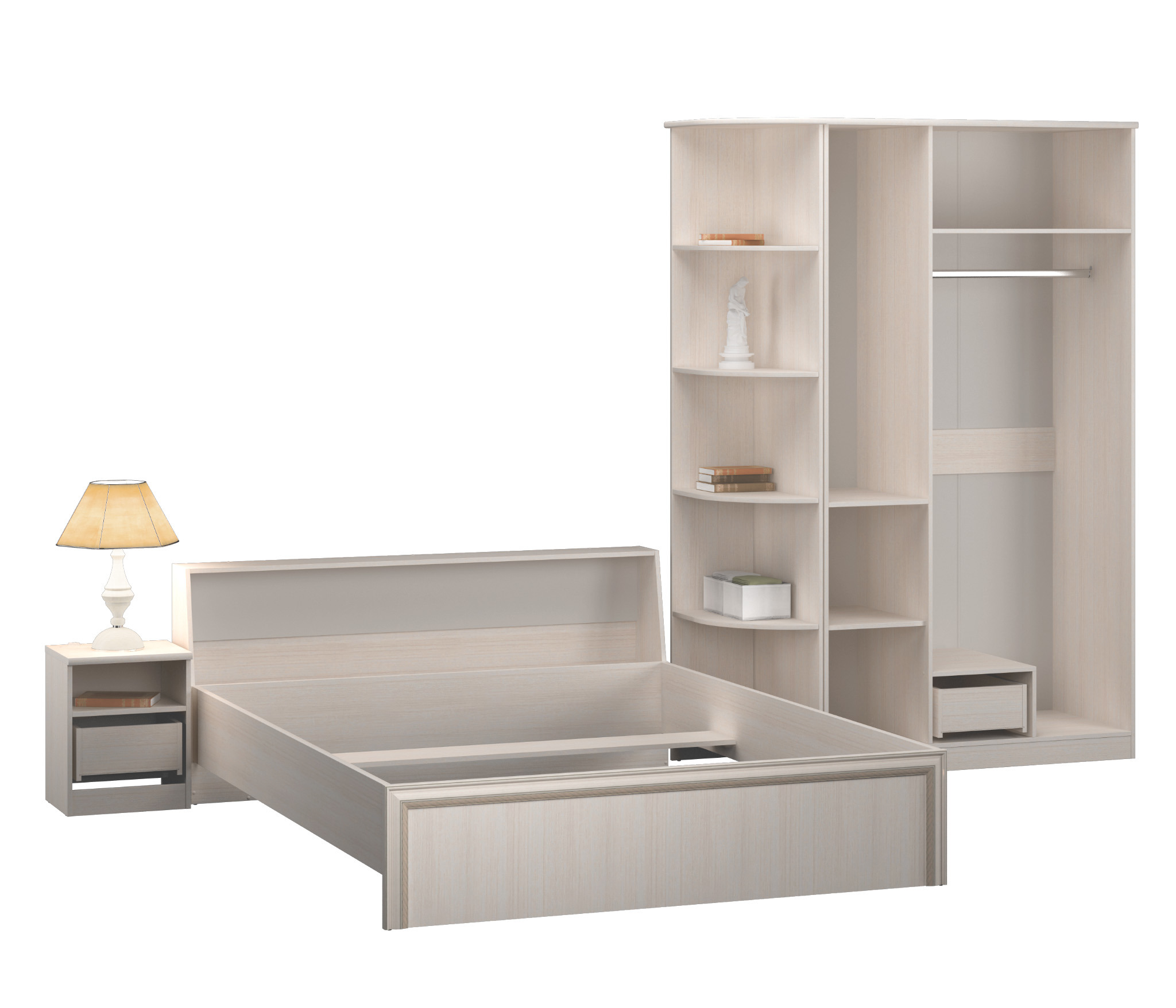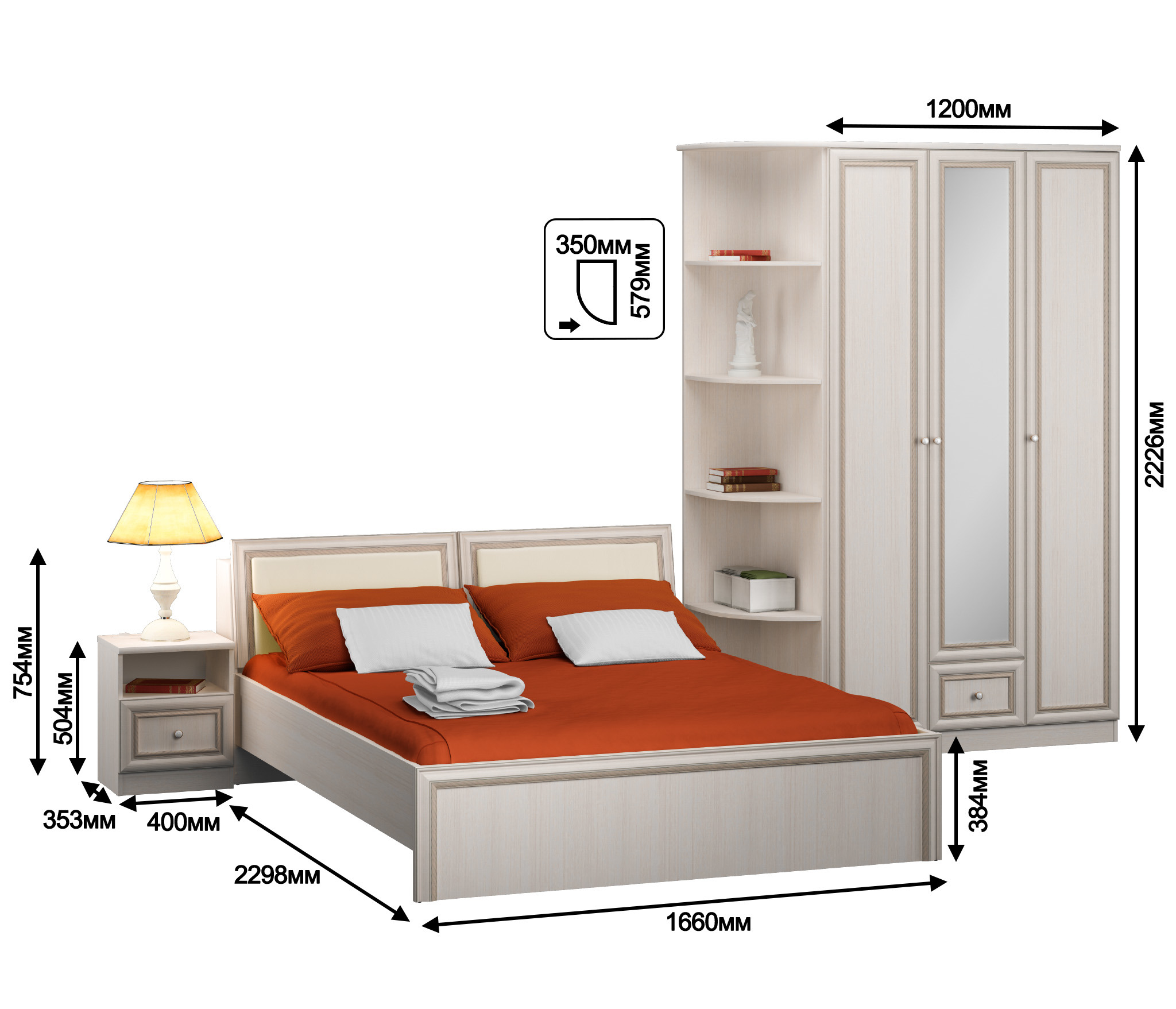 Набор с трехдверным шкафом «Грация Авиньон» подойдет для спальни, выдержанной в спокойных и светлых тонах. В состав комплекта входит трехдверный шкаф с зеркальным фасадом, оборудованный полками и штангой для одежды, а также небольшой выдвижной секцией. В композицию входят удобная двуспальная кровать, вместительная прикроватная тумба и стильный угловой стеллаж.