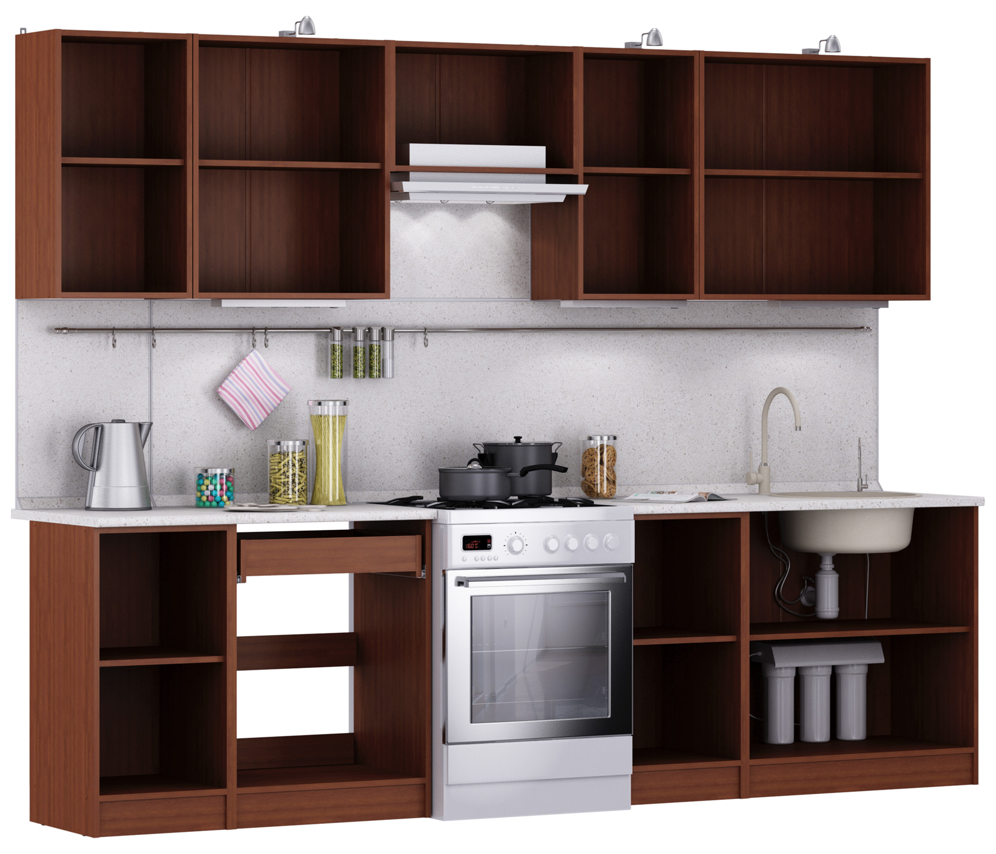 5 полок: полка 40см, полка 60 см, 60см полка над вытяжкой, полка 40см, 80 см с двумя распашными фасадами.
