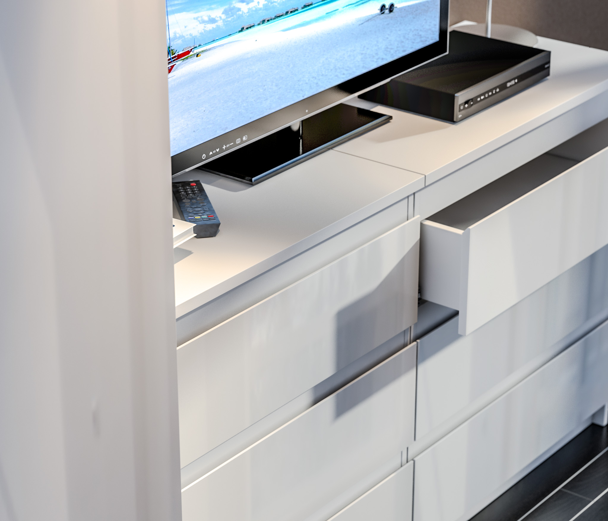 Один из комодов оказался с браком. Глянец совсем не глянцевый.