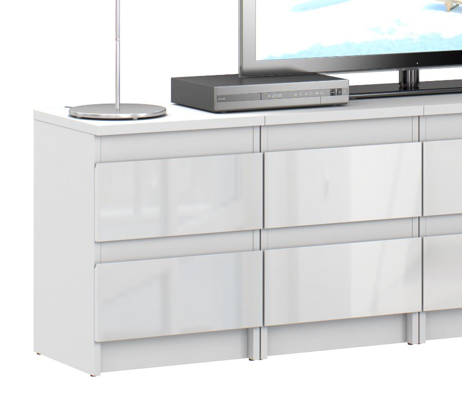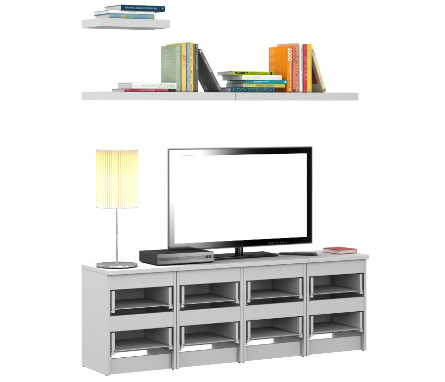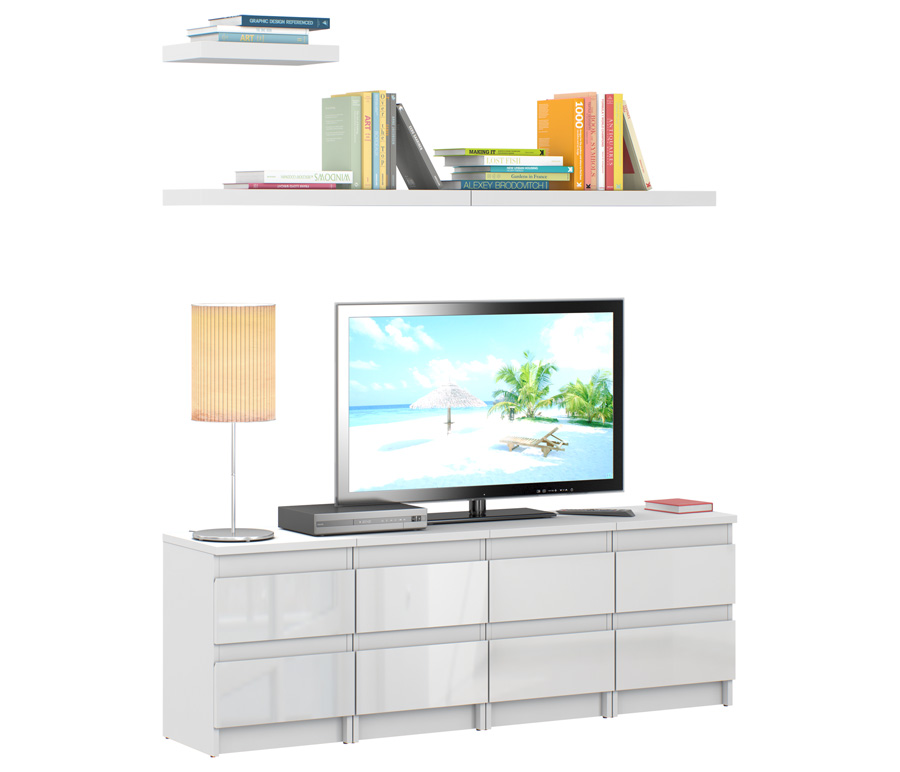 Стенка «Медея» – лучший способ стильно обставить гостиную, одновременно расширив в ней зону полезного пространства. В комплект входят четыре тумбы, каждая из которых оснащена двумя удобными выдвижными ящиками, превосходно подходящими для хранения дисков, журналов, документов и любых других вещей. Белая глянцевая поверхность мебели позволяет набору «Медея» выглядеть очень модно и современно, тогда как сдержанность силуэта и отсутствие декоративных деталей гарантирует идеальное сочетание стенки с окружающей обстановкой. Комплект особенно актуален для размещения телевизора, но также может служить платформой для предметов декора.