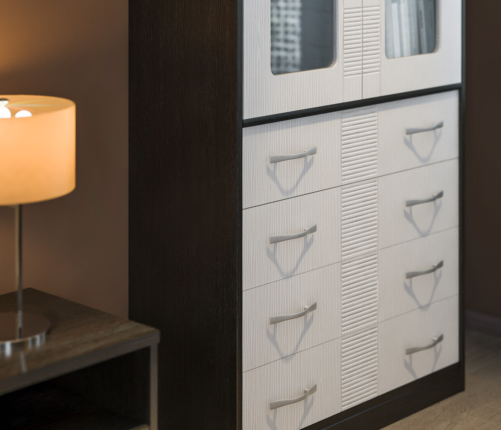 Сочетание темного и светлого цвета,удачно подобранный дизайн,можно комбинировать шкафы.