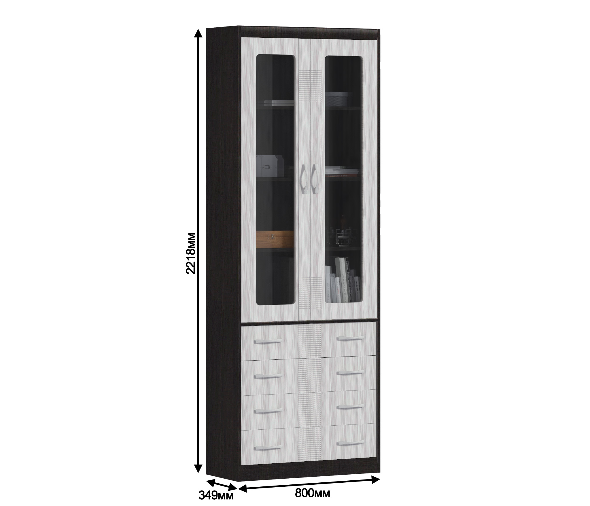 Габаритные размеры шкафа-витрины довольно приличные – ширина 80 см, высота 221 см и глубина 34 см, это довольно вместительный шкаф-витрина, который позволит решить вопросы, связанные с хранением памятных вещей. Визуально шкаф-витрину Сити СБ-212 можно разделить на два отделения. Верхнее – выставочное с прозрачными дверцами и нижнее с четырьмя вместительными ящиками.