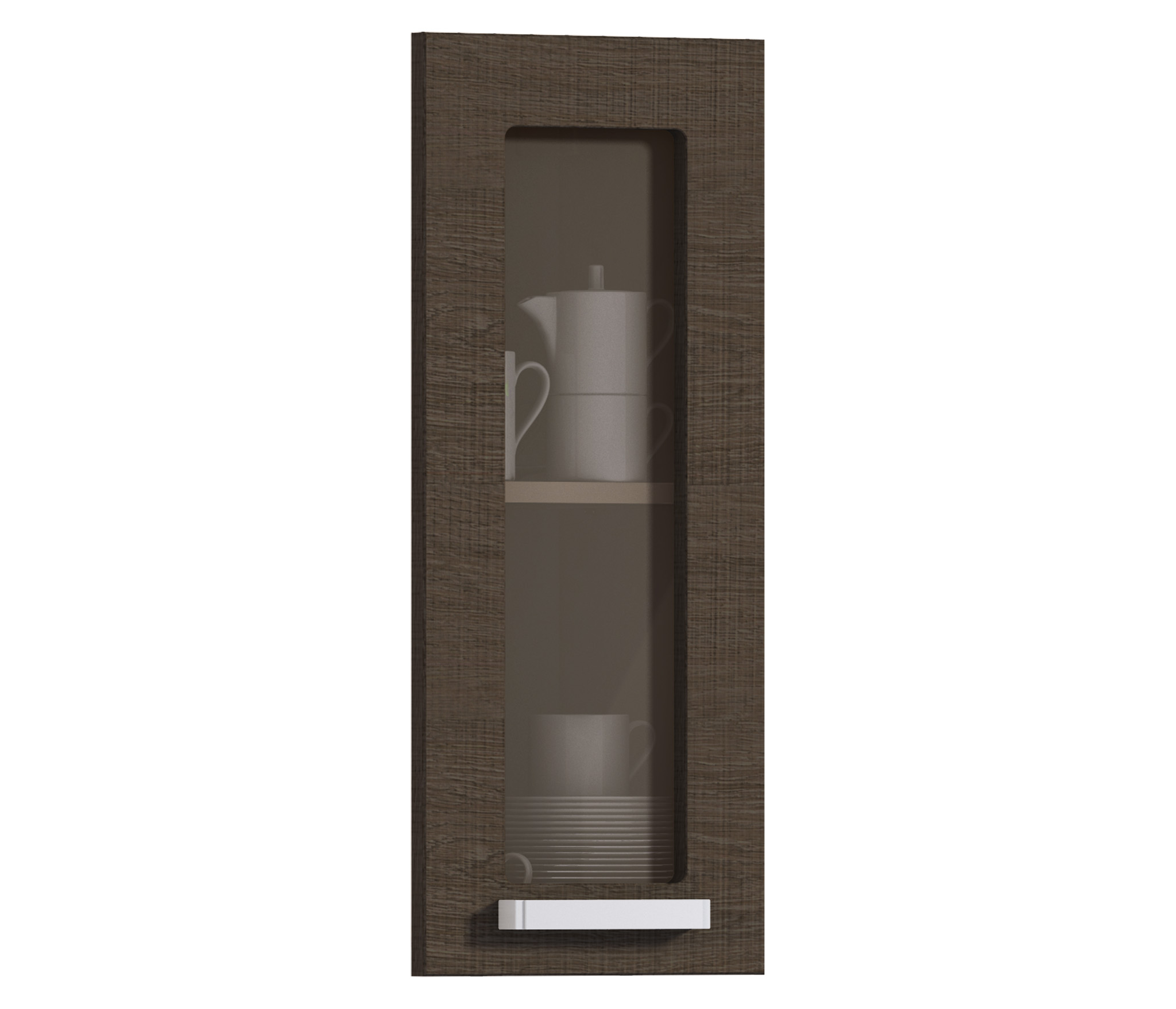 Компактная застекленная дверца для кухонного шкафа. Она открывается справа налево. Она выполнена из качественной прессованной древесины и каленого стекла. Можно выбрать дверцу цвета «дуб Ривер» или «вишня Барселона».
