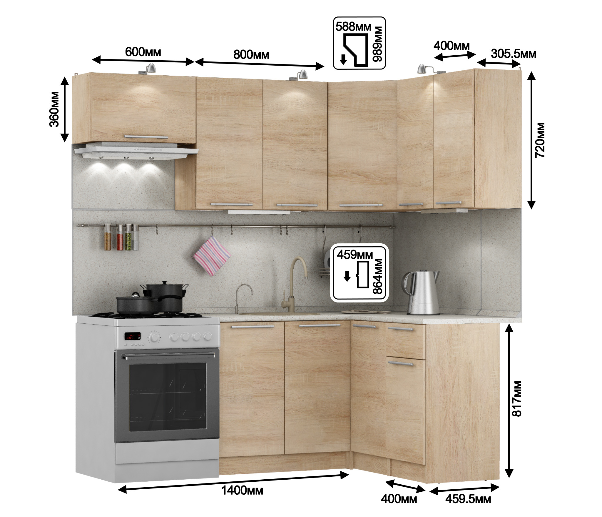 Угловой гарнитур 140х140 см вышел по цене всего 15680 руб. НО! это стоимость только корпусов шкафов с дверцами и ручками. Дополнительно покупались столешница, настенная панель, плинтусы с уголками, кромка, торцевые планки, монтажная шина, мебельные стяжки, навески (те, что идут в комплекте, просто никуда не годятся). Получилось ещё пол столько же от цены, но всё равно очень неплохо. Удалось даже встроить стиральную машину. Правда, для этого пришлось поднять весь гарнитур на 7 см. Ещё из-за газовой трубы надо было обрезать верхний угловой шкаф на 1,5см, но и с этой задачей удалось справиться успешно. Чем меньше кухня, тем сложнее вписать в неё готовый мебельный гарнитур, но с этой "Ангелиной" всё получилось. И для тех, кто будет собирать и устанавливать кухню самостоятельно, два обязательных момента: во-первых, стягивайте все шкафы, как верхние, так и нижние, между собой мебельными стяжками; во-вторых, обязательно крепите нижние шкафы к стене.