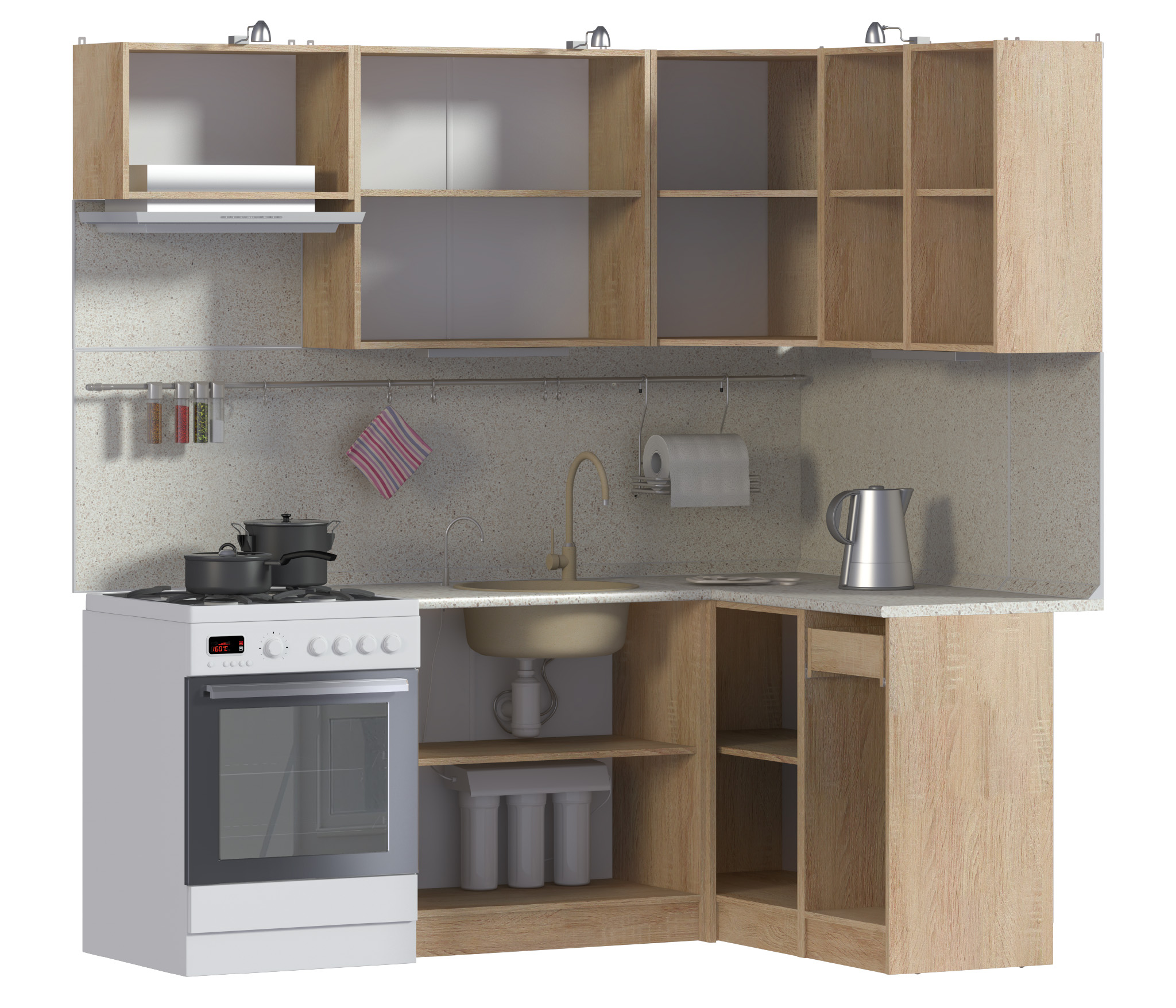 5 полок: полка над вытяжкой 60см, полка 80 см с 2мя фасадами, угловая полка 60 см, полка 40см, полка 40см.