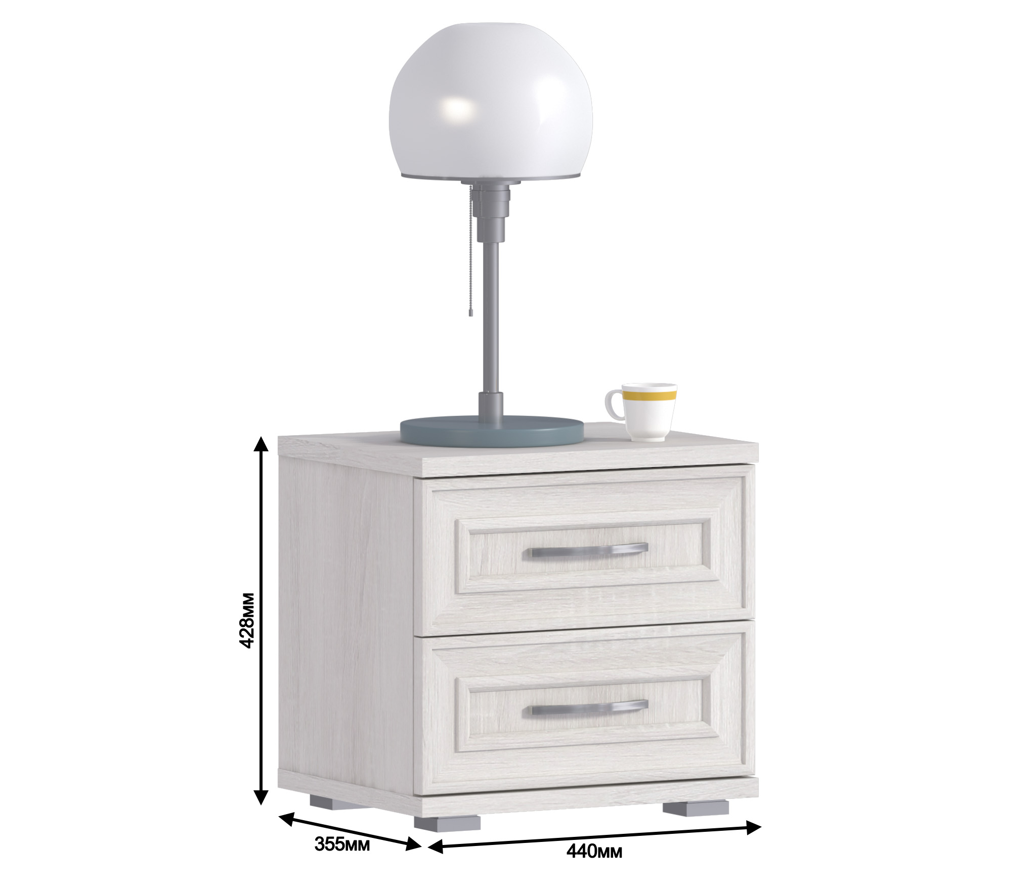 Габаритные размеры тумбы – ширина 44 см, высота 42 см и глубина 35 см. Под столешницей расположены два выдвижных ящика.Корпус и фасады тумбы выполнены из современного и прочного КДСП в цвете «Дуб Сонома Белый». Металлическая ручка-скоба в цвете хром.