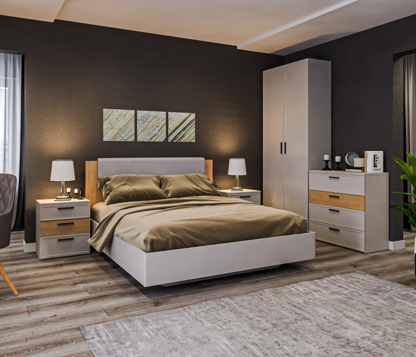Милан Спальня (шкаф, кровать, 2 тумбы, комод) (Серый,Дуб Гамильтон)