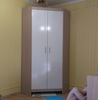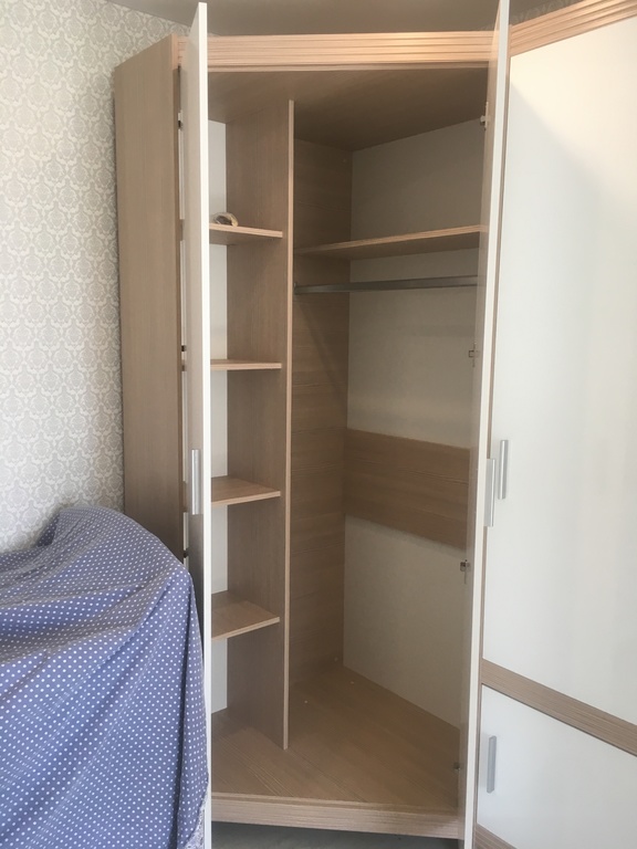 Всегда скептически относилась к угловым шкафам, т.к. одна дверца и ограниченный доступ внутрь не впечатлял. В данной модели понравилось наличие распашных дверей, что в пользовании очень удобно. Шкаф большой, вместительный, доступ к вешалке и полкам свободный, однако я добавила ещё одну штангу, дабы вешать вещи в 2 ряда. Ручки заменила. Петли без доводчика, за ручки (мне и ребенку) не очень удобно оказалось держать, в результате чего они выскальзывают и дверцы сильно бахают + новые ручки очень подходят и облегчают внешний вид. Еще, на мой взгляд, можно было бы выше сделать вешалку и не такой глубокой полку антресоли (люблю когда вещи висят а не разложены). Ну и не могу не заметить - шкаф стоит на боковых стенках, а сзади "ножка" ну очень сомнительная, попросила сборщика укрепить её по обе стороны опорными мебельными ножками, с ними гораздо спокойнее стало )