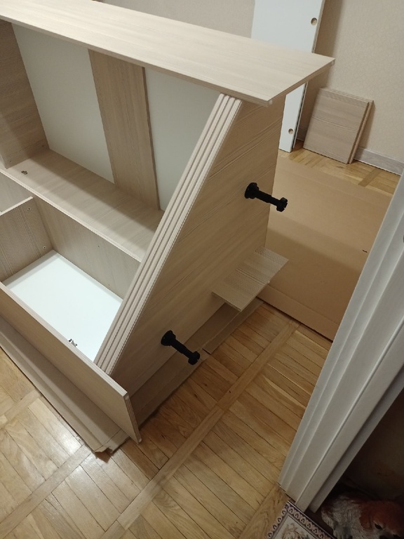 Здравствуйте. Очень понравилась мебель этой серии. Единственный недостаток, это непонятная схема сборки, если со стеллажами все просто, то вот со шкафом пришлось повозиться) На деталях было несколько сколов, но это уже вопрос доставки.
