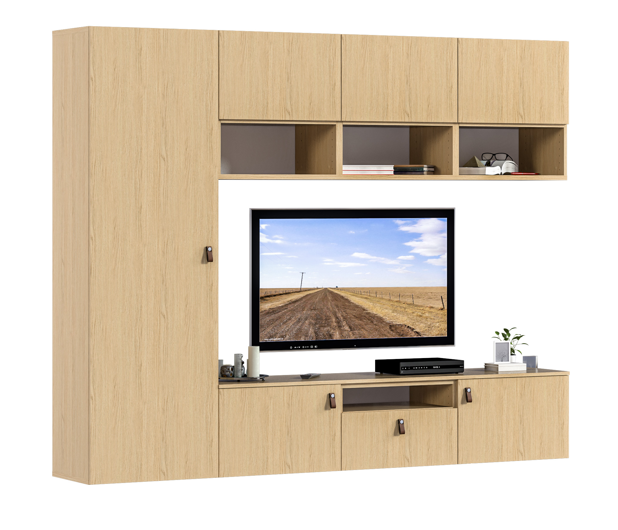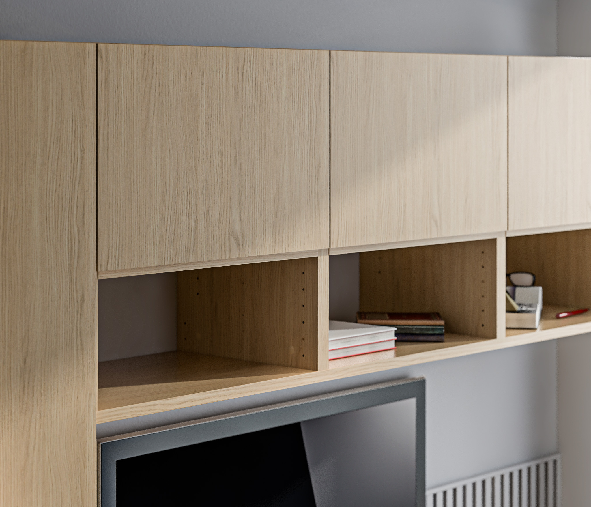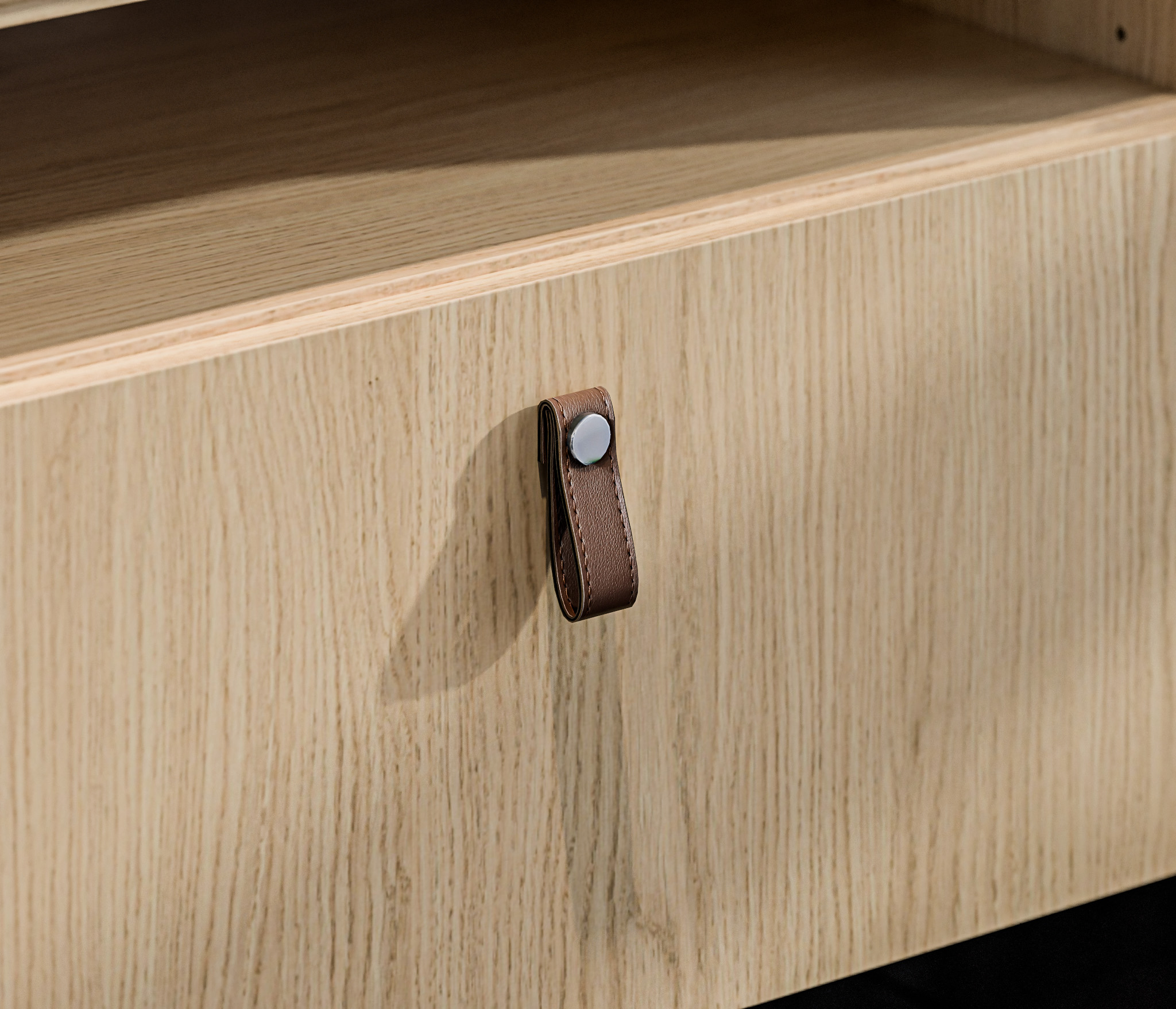 Выбор ручек является дополнительной опцией. В данной гостиной представлена ручка-кнопка в цвете хром/капучино для тумбы под телевизор и пенала, а верхняя полка оснащена механизмом Push To Open, который позволяет открывать ее легким нажатием.