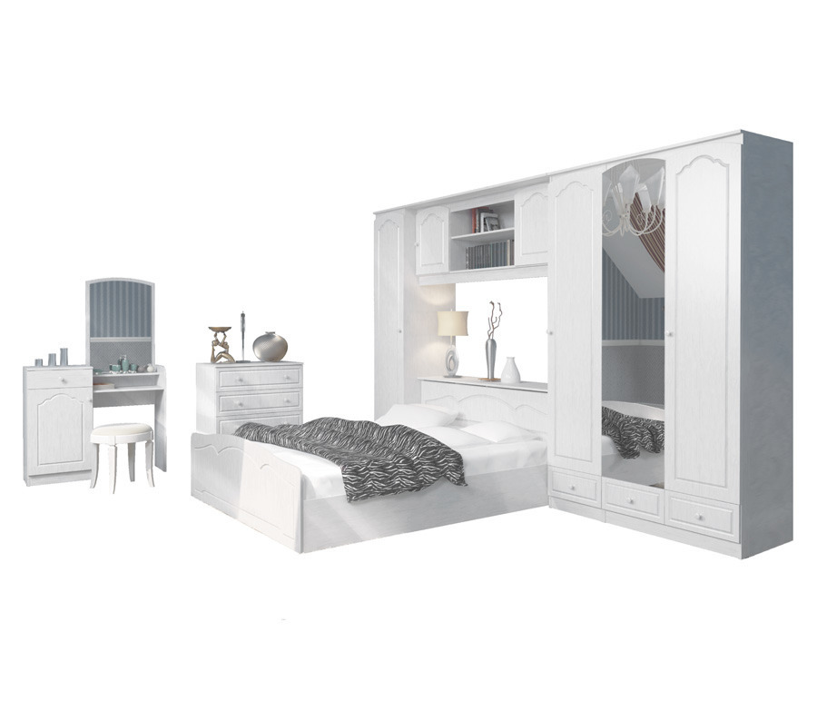Спальный гарнитур «Амалия» представляет собой воплощение мечты. В него включены вместительные шкафы и полки, комфортная кровать, функциональный комод, изящный туалетный столик и стильное зеркало. Белоснежный цвет, в котором выдержана вся композиция, вдохнет в интерьер безмятежную романтику легкости и невесомого спокойствия.
