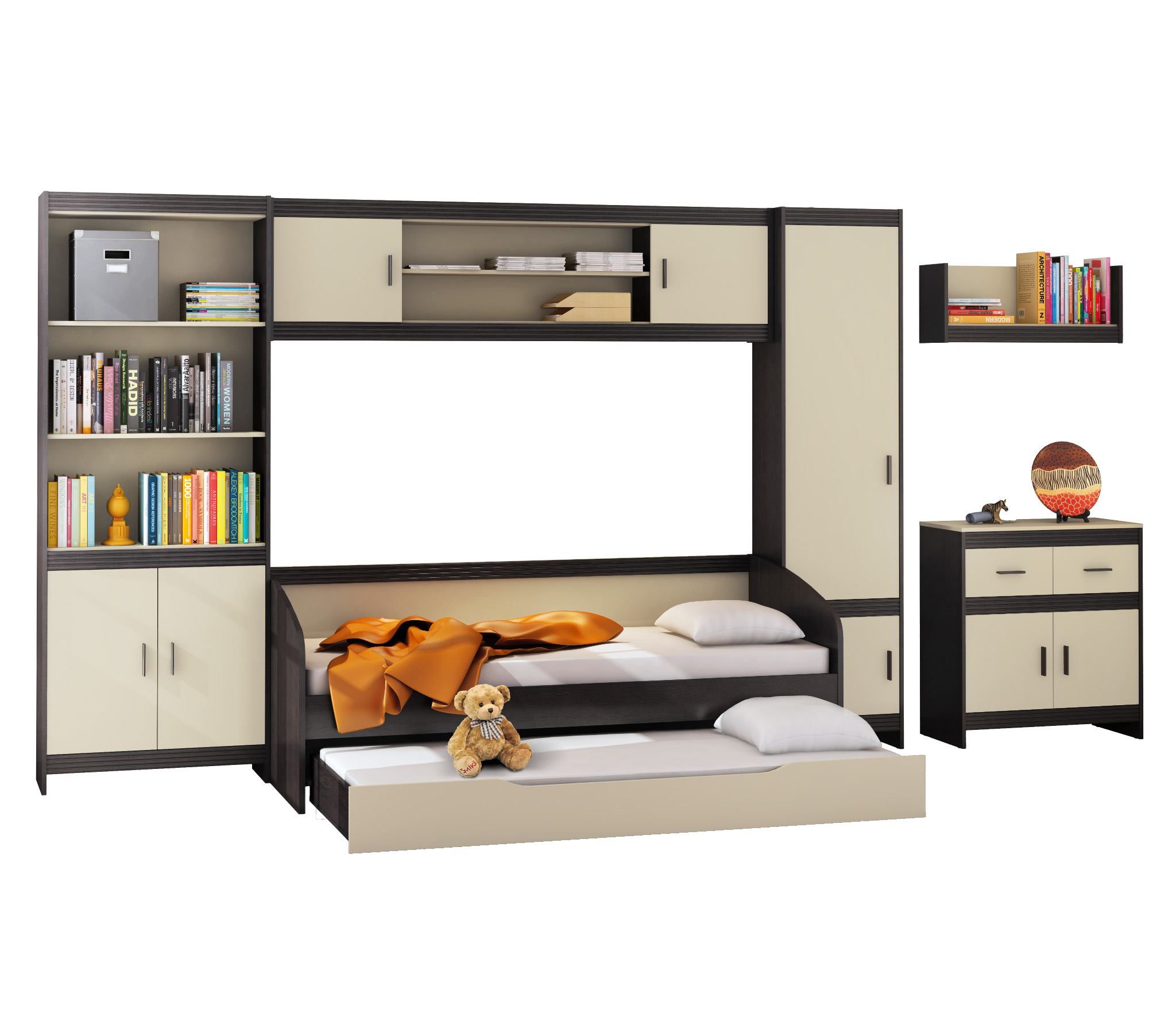 Дизайн этого мебельного гарнитура для детской комнаты строится на гармоничном сочетании цветов и геометрических объемов. Каждый модуль идеально дополняет общую композицию и при этом функционально оправдан. В комплект входит: один шкаф с закрытым фасадом и ящиком, стеллаж с рядом полок, кровать с удобным выдвижным ящиком для постельного белья, горизонтальная навесная секция для хранения необходимых вещей.